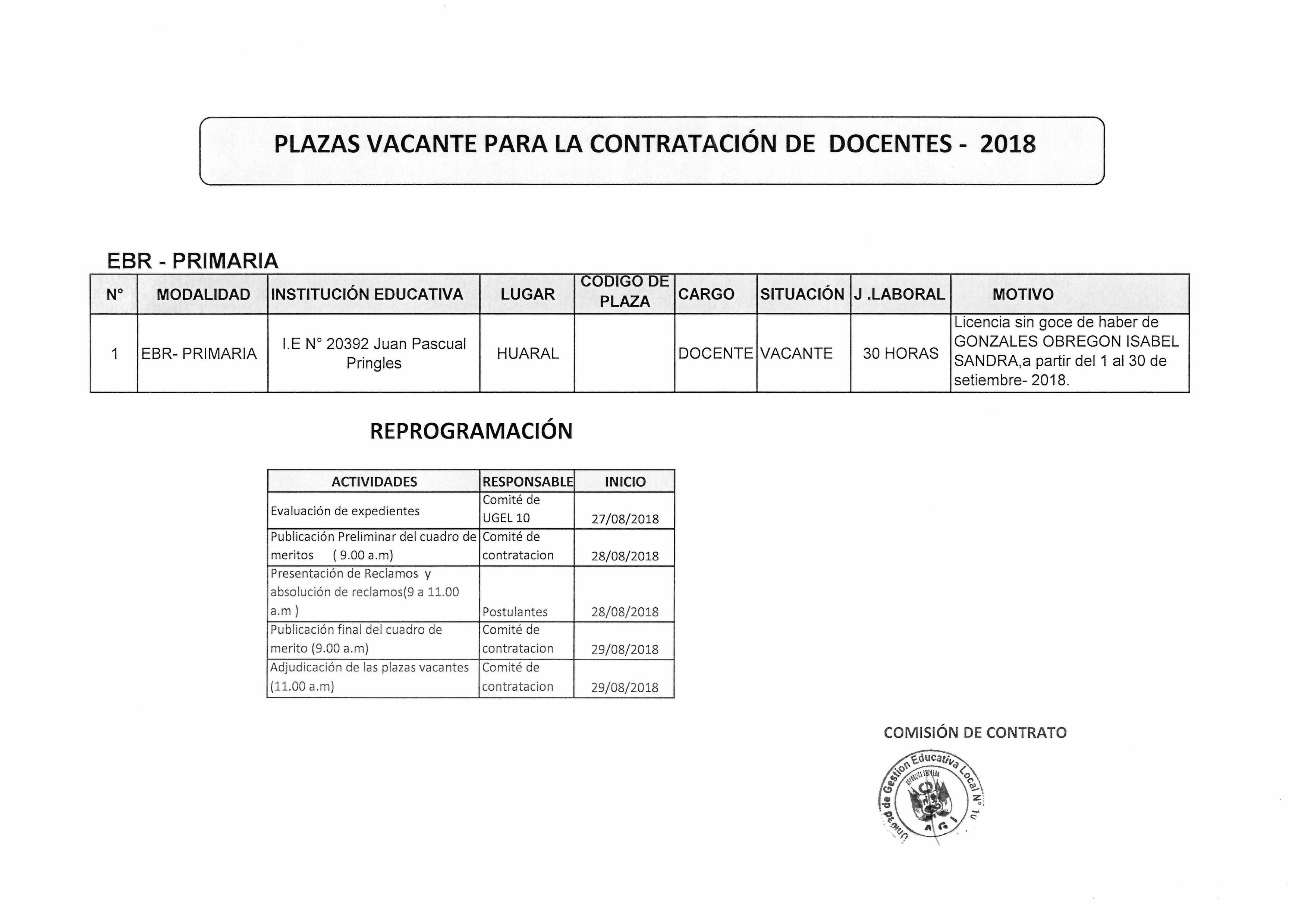 24 Ago,2018 Convocatorias COMMENTS PLAZA VACANTE PARA LA CONTRATACIÓN DE DOCENTES-EBR PRIMARIA-REPROGRAMACIÓN