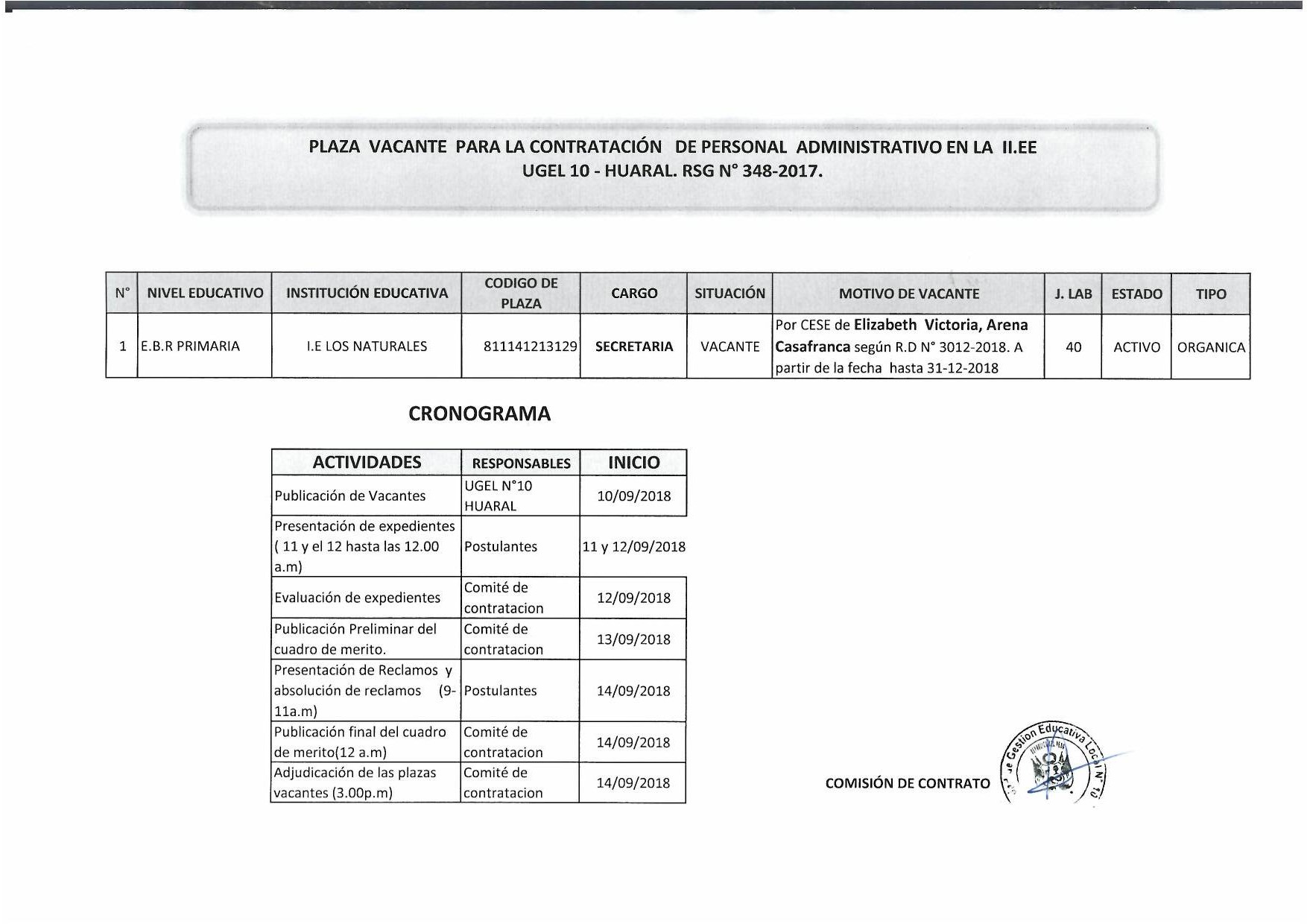 10 Sep,2018 Convocatorias COMMENTS PLAZA VACANTE PARA LA CONTRATACIÓN DE PERSONAL ADMINISTRATIVO EN LA II.EE. RSG N°348-2017