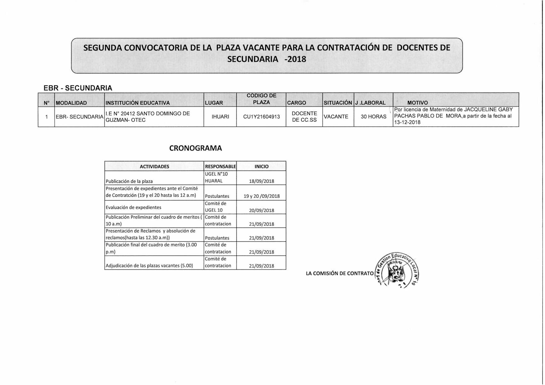 17 Sep,2018 Convocatorias COMMENTS SEGUNDA CONVOCATORIA DE LA PLAZA VACANTE PARA LA CONTRATACIÓN DE DOCENTES DE SECUNDARIA - 2018