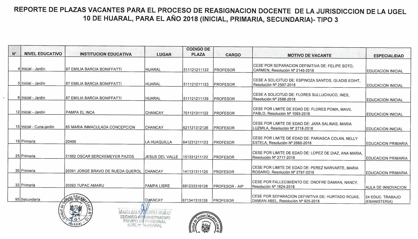 18 Dic,2018 Convocatorias COMMENTS REPORTE DE PLAZAS VACANTES PARA EL PROCESO DE REASIGNACIÓN DOCENTE DE LA JURISDICCION DE LA UGEL 1O DE HUARAL