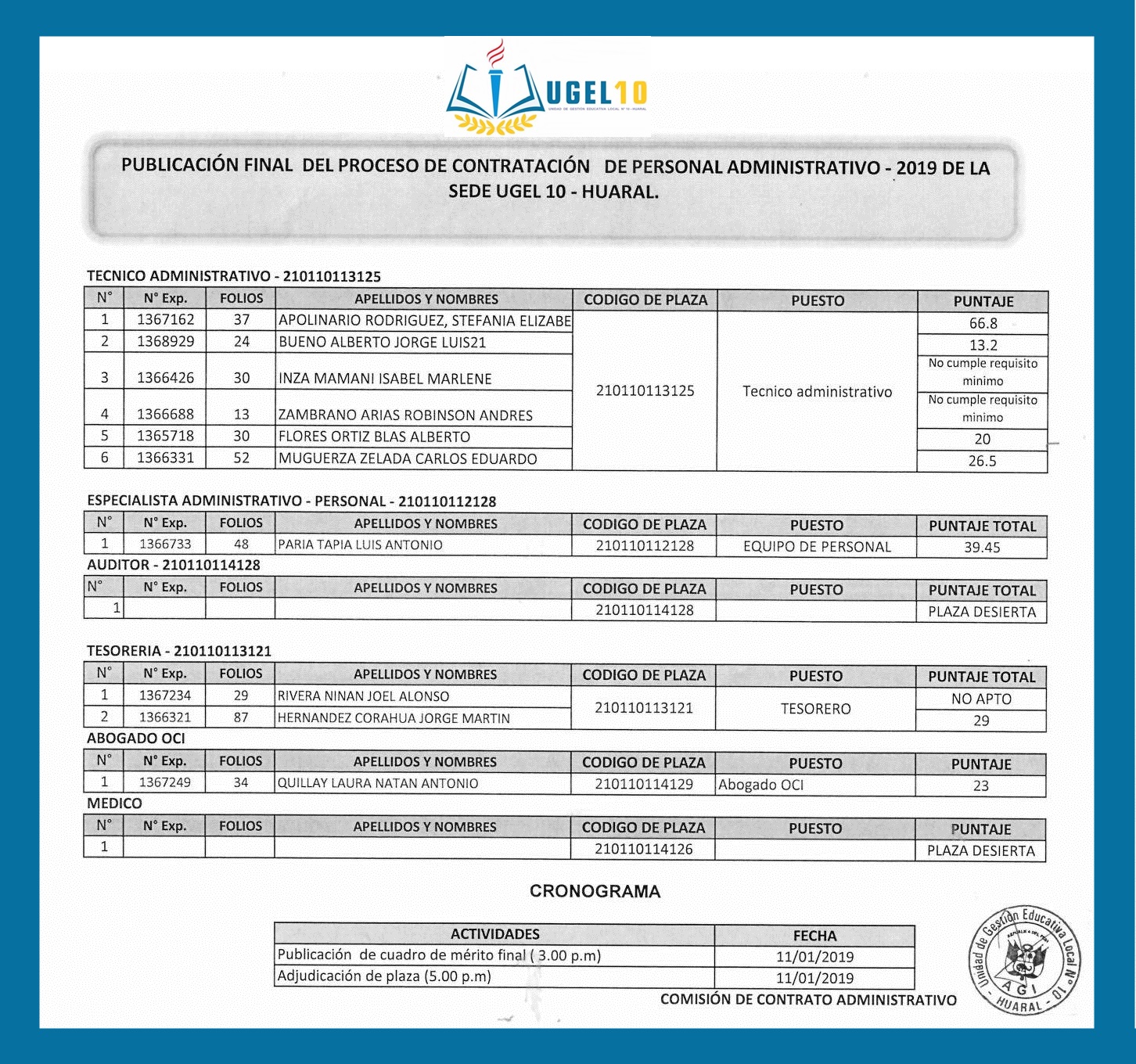 11 Ene,2019 Convocatorias COMMENTS Publicación Final de las Plazas Vacantes para el Proceso de Contratación de Personal Administrativos en la Sede UGEL 10