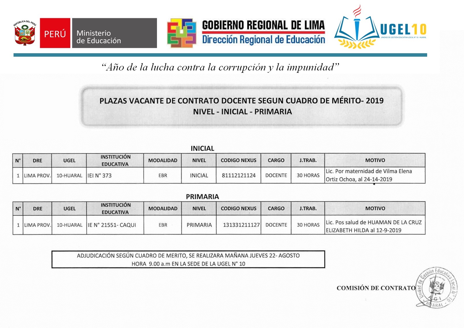 26 Ago,2019 Convocatorias COMMENTS PROCESO DE ENCARGO DE PLAZAS VACANTES DE CARGOS DIRECTIVO DE E.B.E 2019 - ETAPA I Leer más