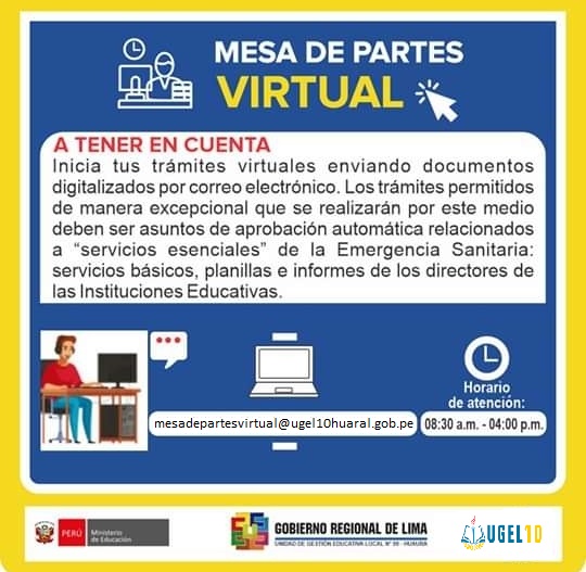 30 Abr,2020 Noticias COMMENTS MESA DE PARTES VIRTUAL. Inicia tus trámites virtuales enviando documentos digitalizados por correo electrónico. HORARIO DE ATENCIÓN :De lunes a viernes de 08.30am - 04.00 pm.