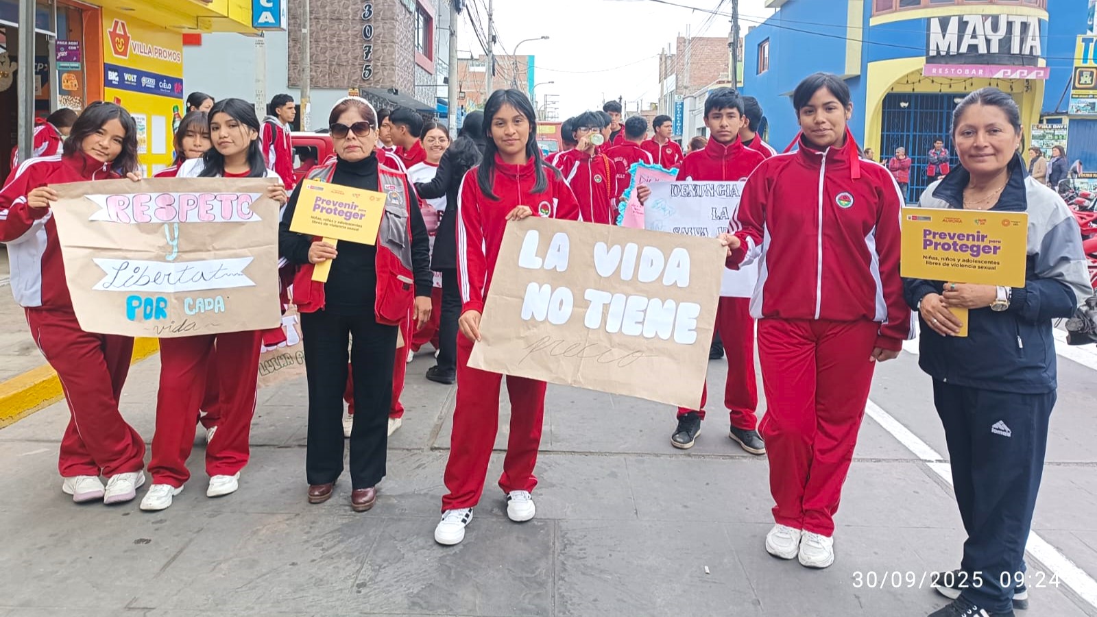 Estudiantes de diversas II. EE. participaron activamente con creativas pancartas y mensajes de reflexión, recorriendo las principales calles del distrito.