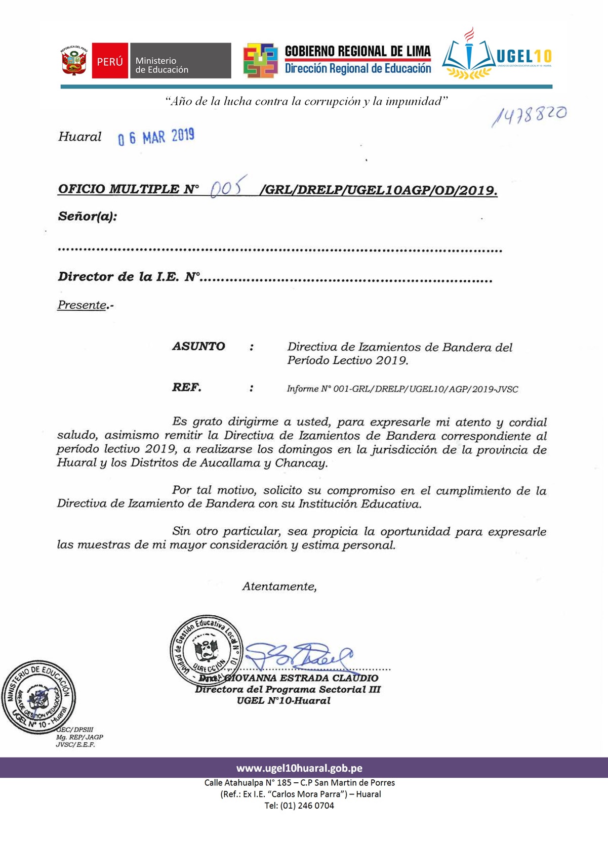12 Mar,2019 Comunicados COMMENTS Directiva de Izamientos de Bandera del Periodo Lectivo 2019. ver y descargar Directiva N°001-2019-UGEL10