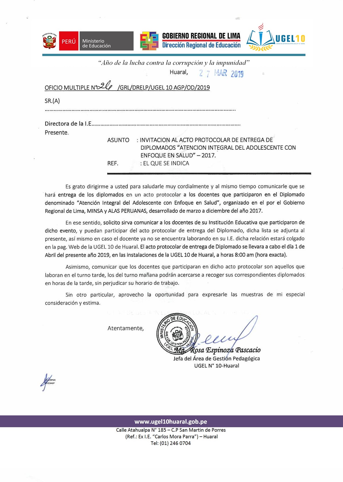 27 Mar,2019 Comunicados COMMENTS Invitación Acto Protocolar a los Docentes que Participaron en Diplomado en "Atención Integral del Adolescente con Enfoque de Salud"