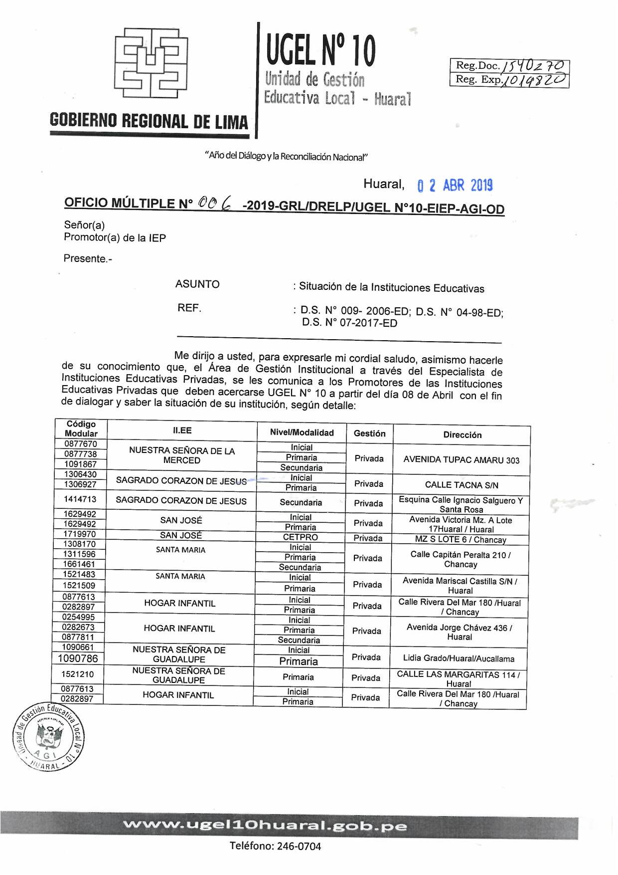 03 Abr,2019 Comunicados COMMENTS Oficio Múltiple para las siguientes Instituciones Educativas Privadas