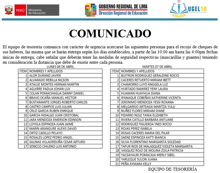 02 Abr,2020 Comunicados COMMENTS El equipo de Tesorería comunica con carácter de urgencia acercarse las siguientes personas para el recojo de cheques de sus haberes.