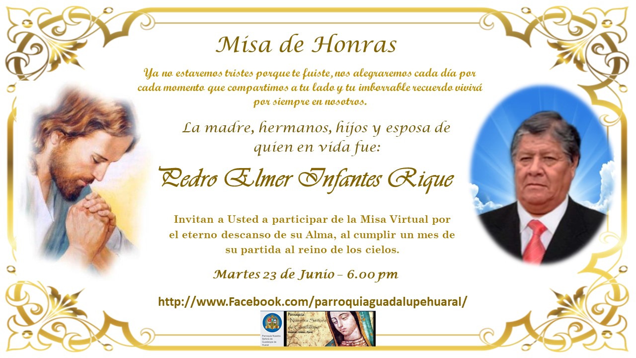 Los invitamos a participar de la Misa Virtual por el eterno descanso del alma de nuestro compañero PEDRO ELMER INFANTES RIQUE, al cumplirse un mes de su partida al reino de los cielos. La cual se llevará a cabo el día martes 23 de junio a las 6:00 p.m. a través del Facebook Live de la Parroquia Nuestra Señora de Guadalupe de Huaral.