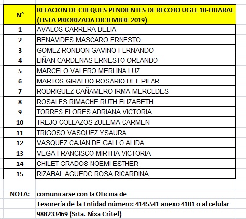 23 Dic,2020 Comunicados COMMENTS RELACION DE CHEQUES PENDIENTES DE RECOJO UGEL10-HUARAL (LISTA PRIORIZADA DICIEMBRE 2019)
