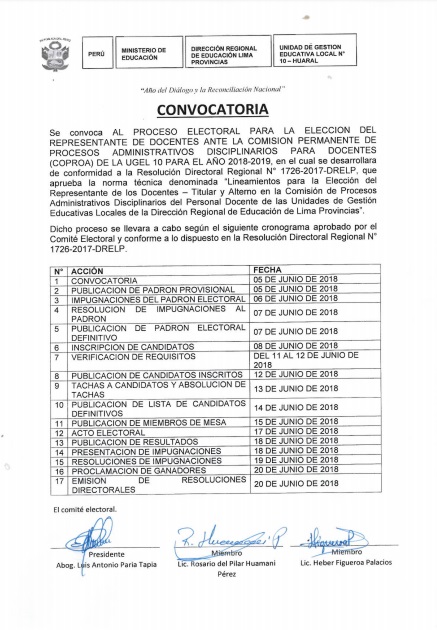 04 Jun,2018 Comunicados COMMENTS Convocatoria electoral para la elección del representante de docentes ante la Comisión Permanente de Procesos Administrativos Disciplinarios para Docentes (COPROA) - Ugel 10 Ver aquí padrón electoral de docentes de las II.EE. Públicas