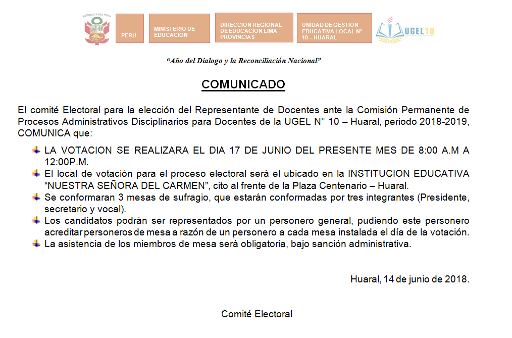 14 Jun,2018 Comunicados COMMENTS Elecciones del Representante de Docentes ante la Comisión Permanente de Procesos Administrativos Disciplinarios para Docentes de la UGEL 10 [hora, lugar y fecha]