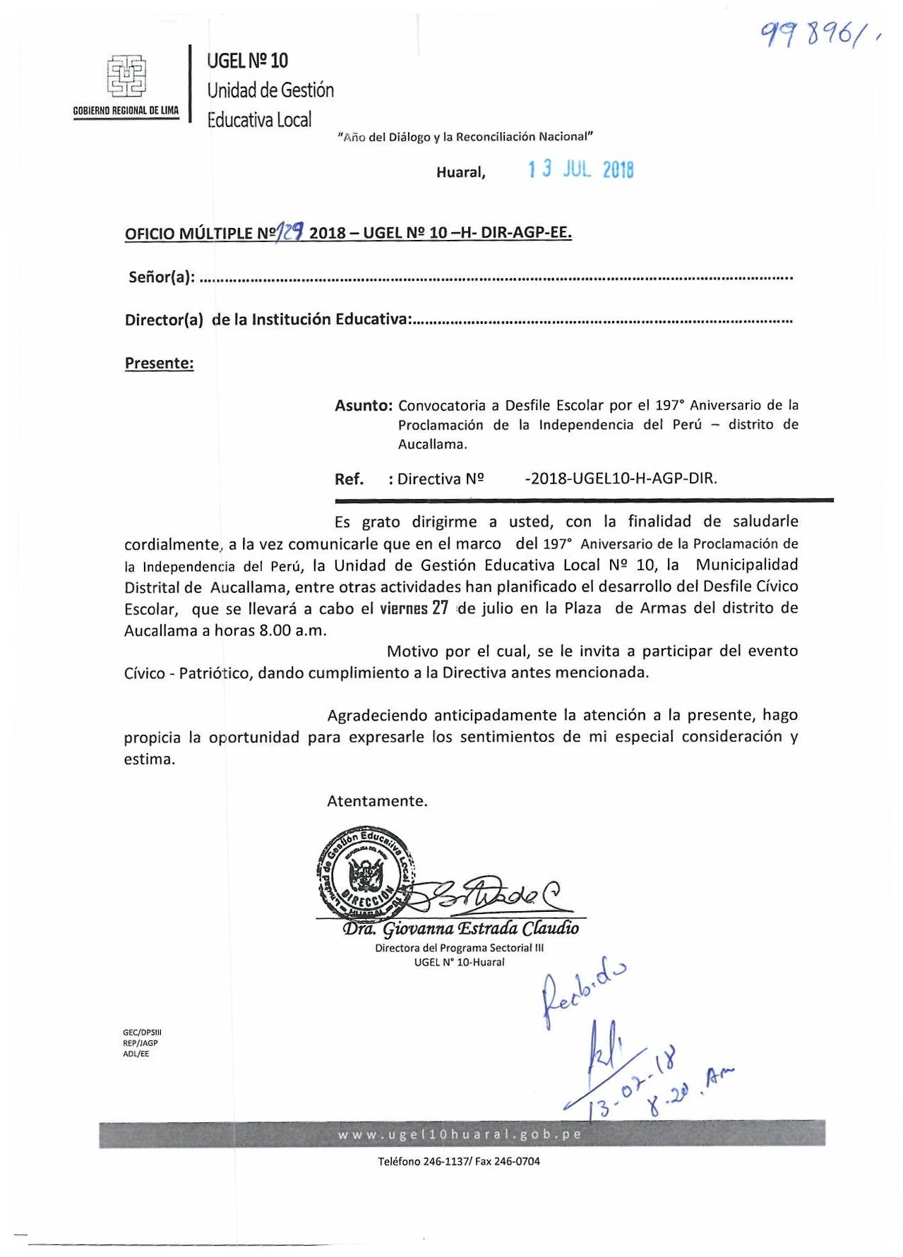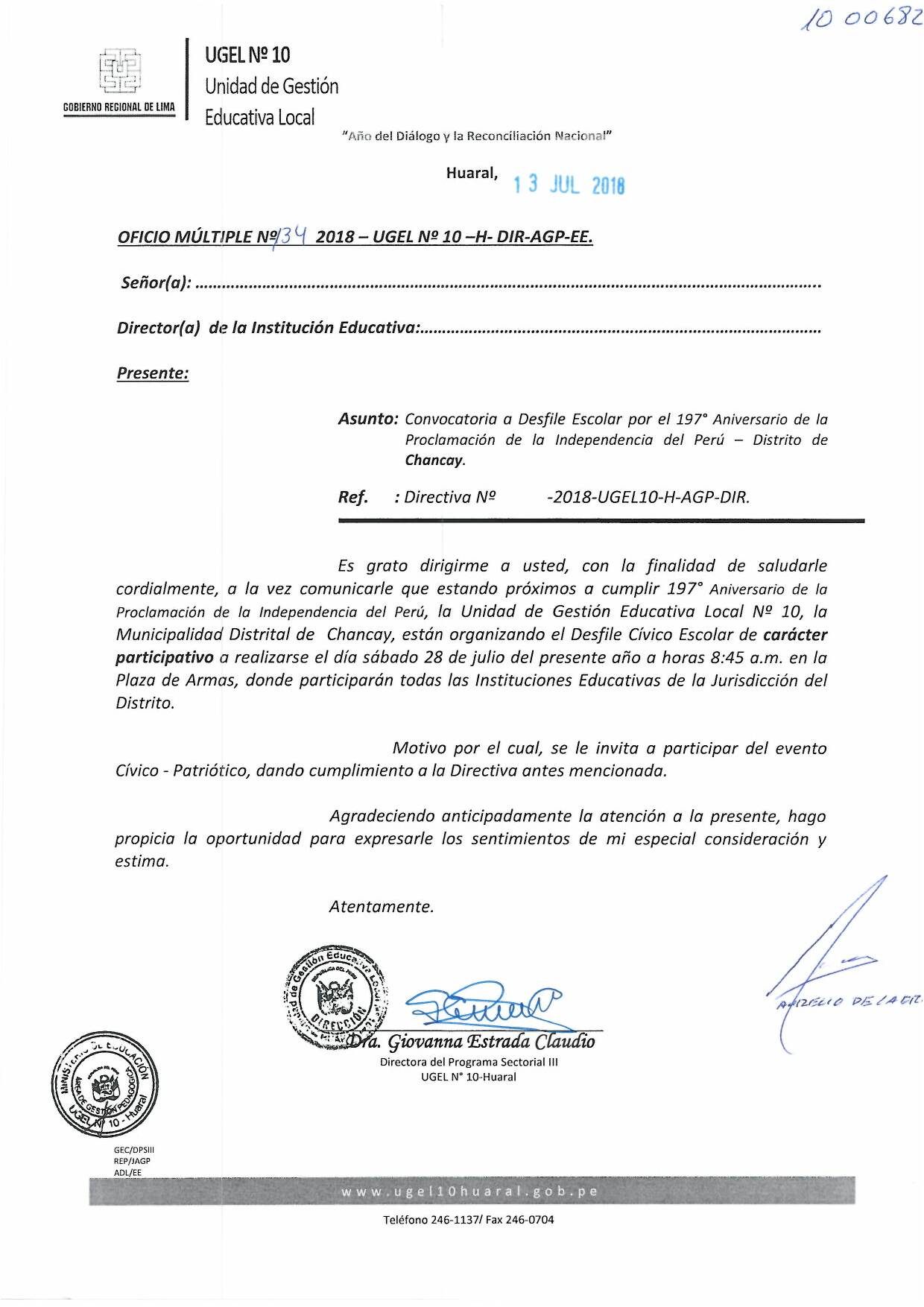 17 Jul,2018 Comunicados COMMENTS Convocatoria a Desfile Escolar por el 197° Aniversario de la Proclamación de la Independencia del Perú [Huaral, Aucallama y Chancay] ver Directiva 010-2018 - Huaral ver Directiva 008-2018 - Aucallama ver Directiva N° 009-2018 - Chancay