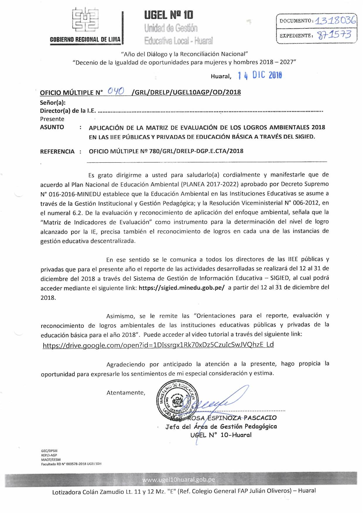 17 Dic,2018 Comunicados COMMENTS Aplicación de la Matriz de Evaluación de los Logros Ambientales 2018. ver Orientaciones para el reporte, evaluación y reconocimientos de logros ambientales de las II.EE Públicas y Privadas de la Educación Básica para el año 2018.