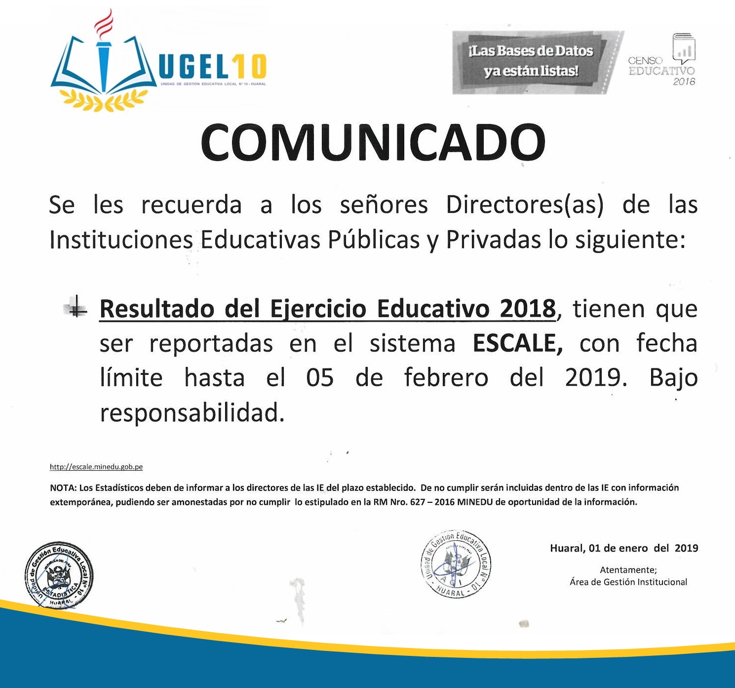 01 Feb,2019 Comunicados COMMENTS Comunicado II.EE Públicas y Privadas - Reportar Resultado del Ejercicio Educativo 2018