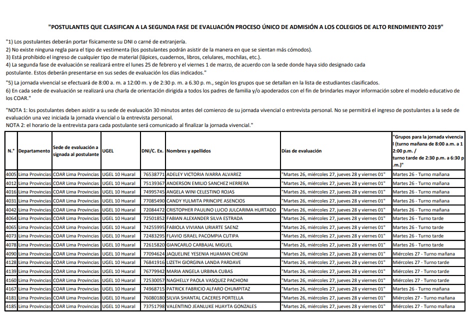 23 Feb,2019 Comunicados COMMENTS COAR - Postulantes que Clasifican a la Segunda Fase de Evaluación Proceso Único de Admisión a los Colegios de Alto Rendimiento 2019