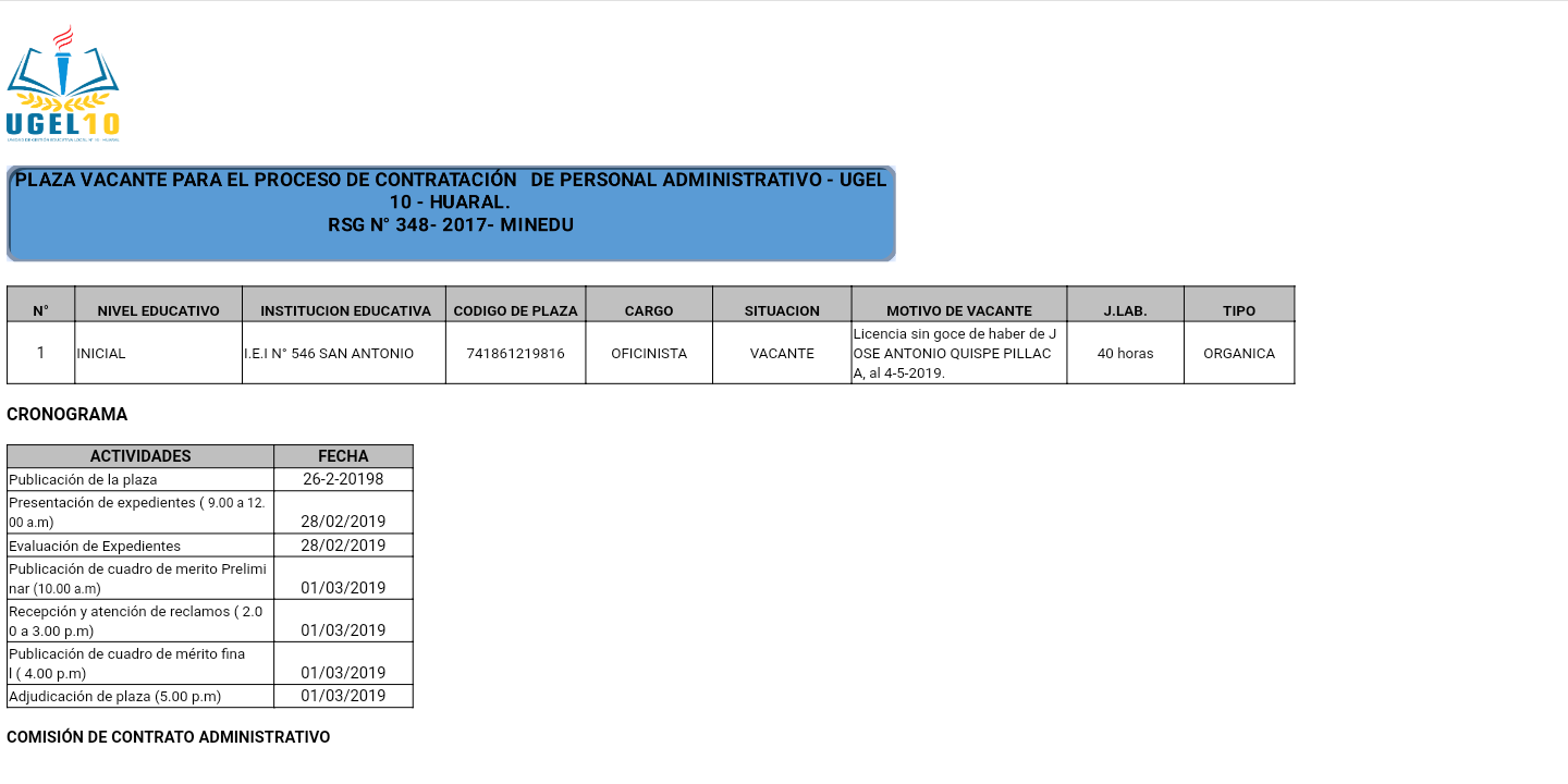26 Feb,2019 Convocatorias COMMENTS Plaza Vacante para el Proceso de Contratación de Personal Administrativo en I.E.