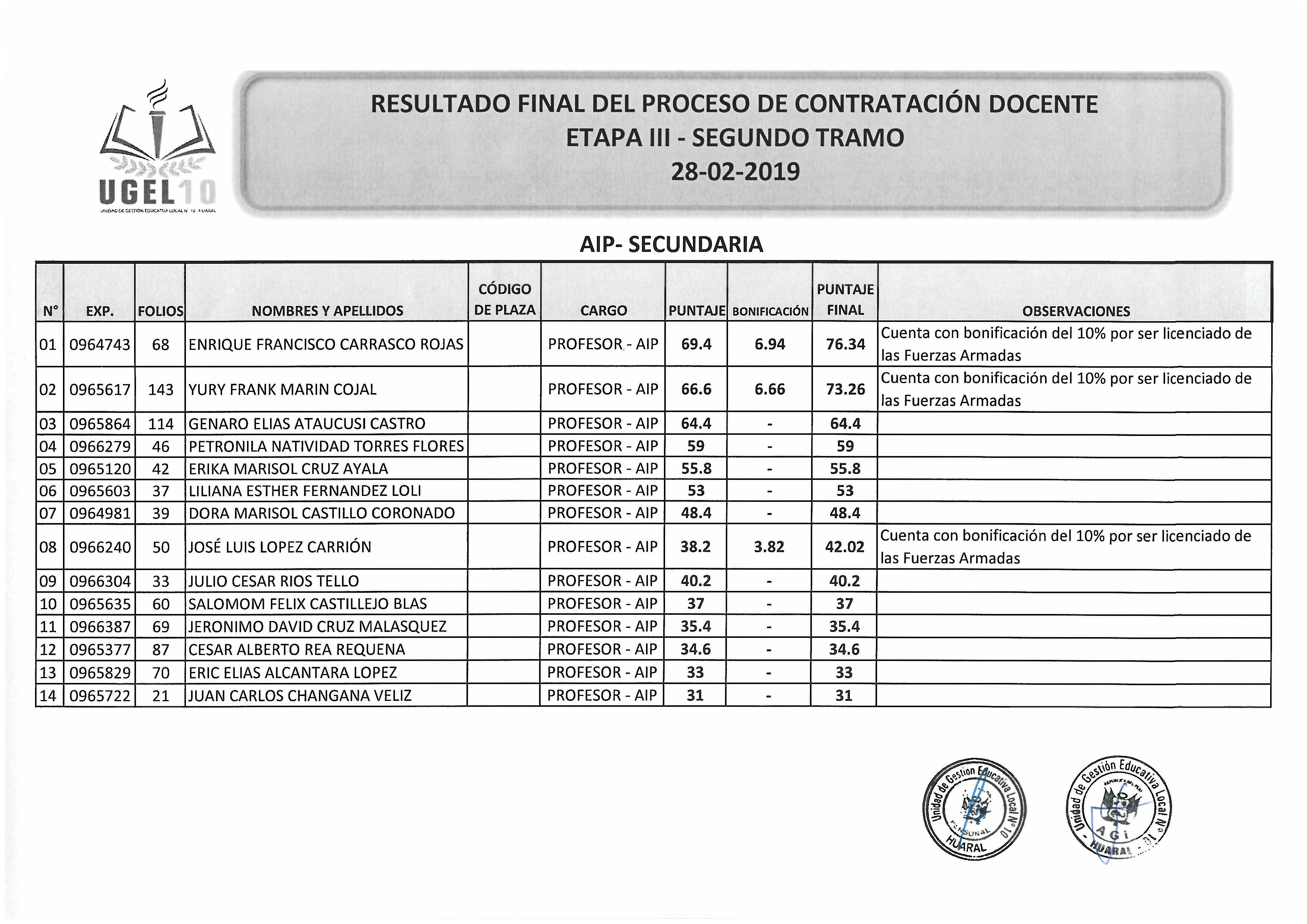 28 Feb,2019 Convocatorias COMMENTS RESULTADO FINAL DEL PROCESO DE CONTRATACIÓN DOCENTE . AIP-SECUNDARIA