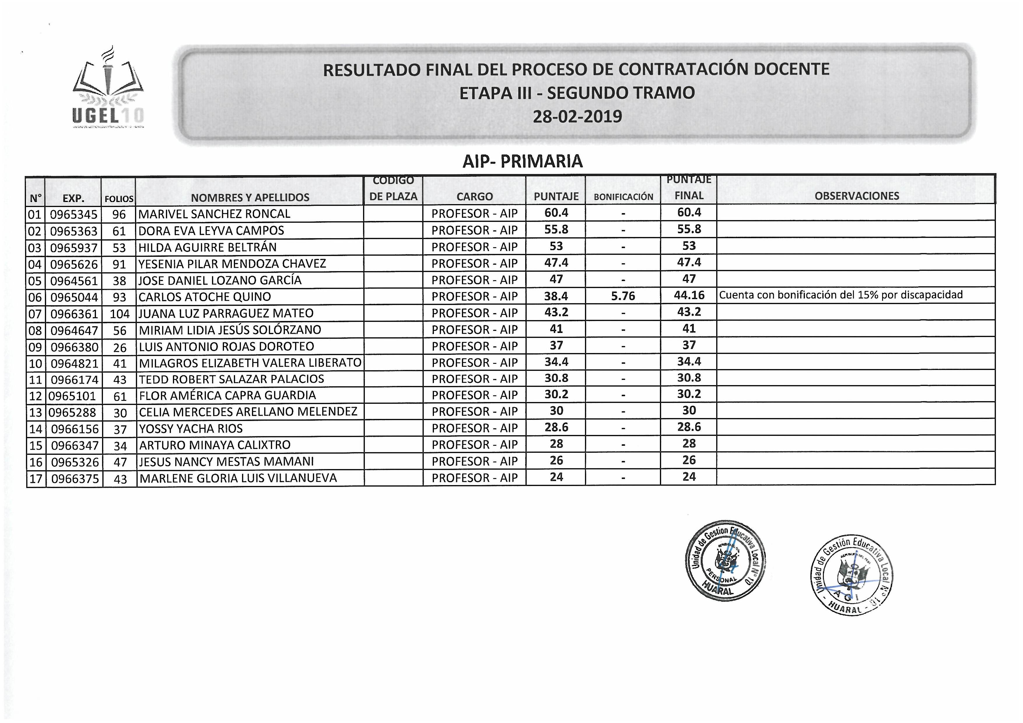 28 Feb,2019 Convocatorias COMMENTS RESULTADO FINAL DEL PROCESO DE CONTRATACIÓN DOCENTE . AIP-PRIMARIA