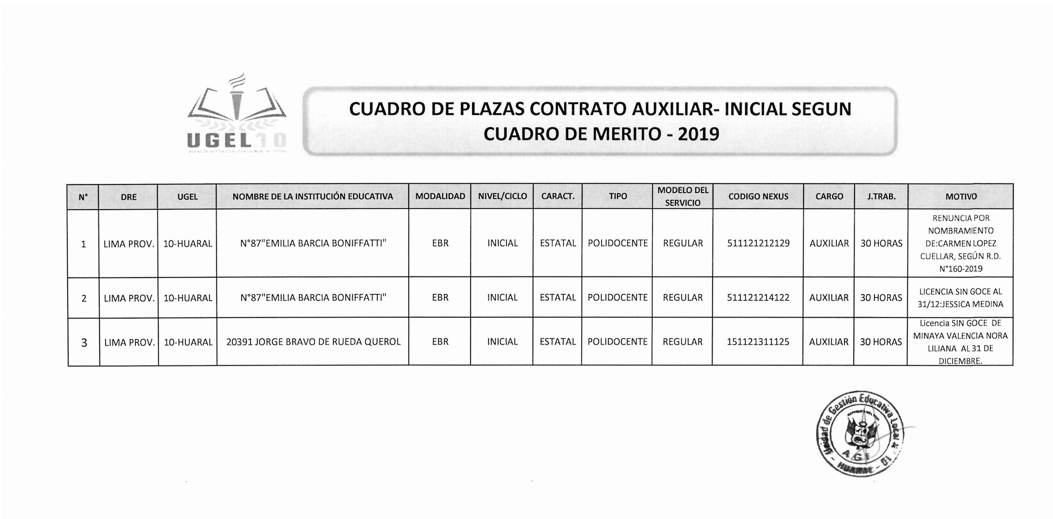 08 Mar,2019 Convocatorias COMMENTS CUADRO DE PLAZAS CONTRATO AUXILIAR- INICIAL SEGÚN CUADRO DE MERITO-2019