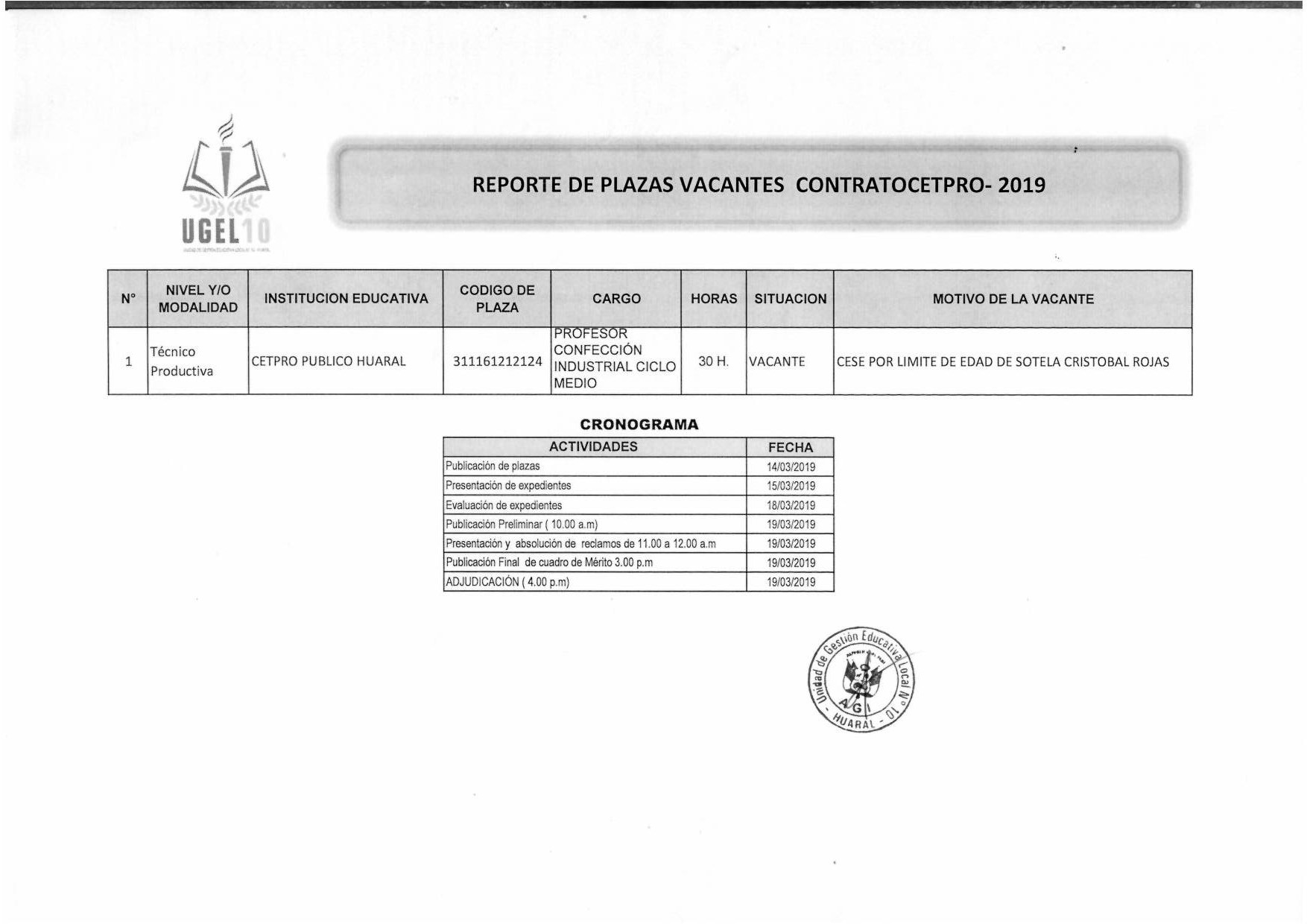 14 Mar,2019 Convocatorias COMMENTS Reporte de Plazas Vacantes Contrato Docente 2019 Secundaria (EPT-Relgión) - CETPRO