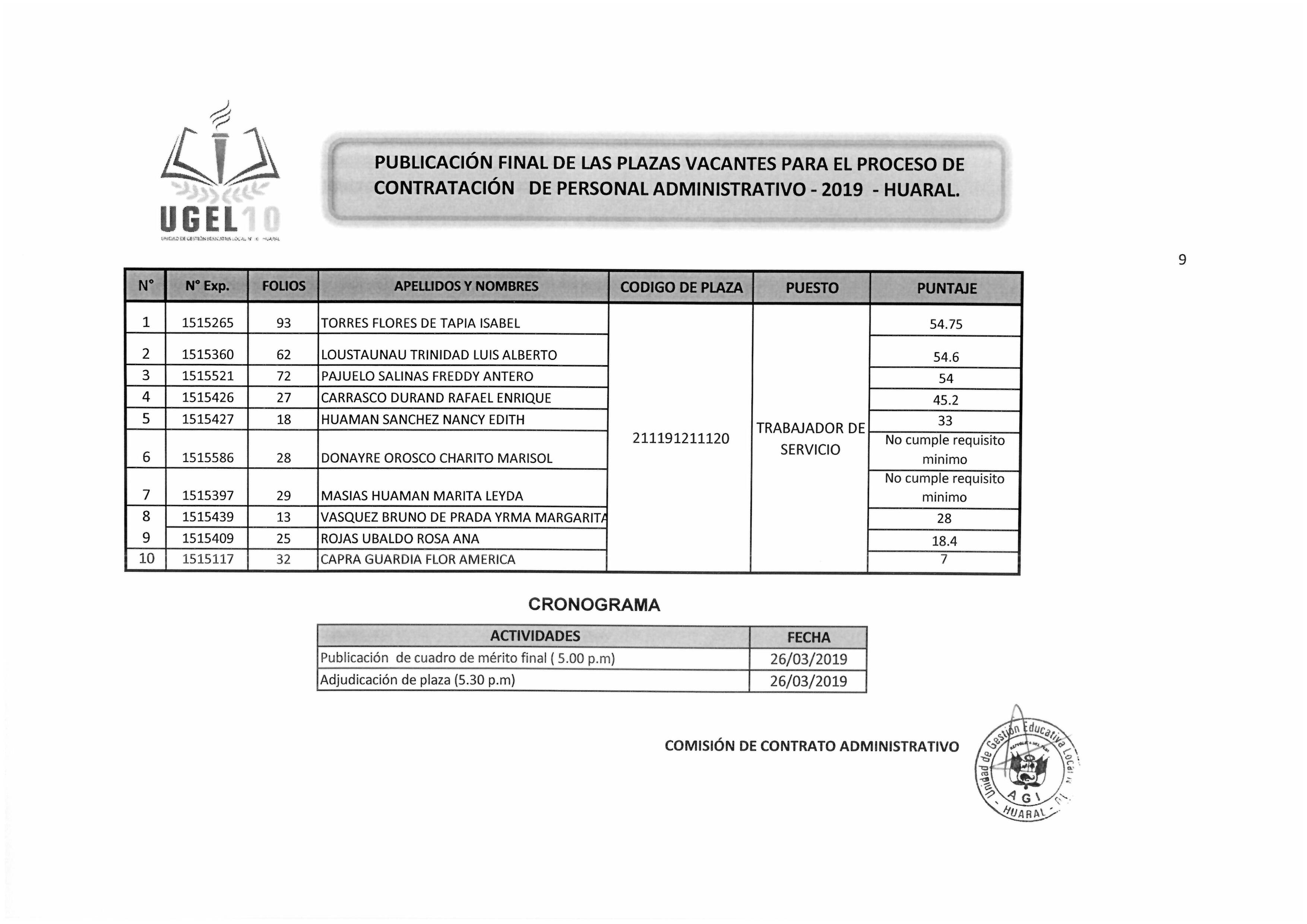 26 Mar,2019 Convocatorias COMMENTS PUBLICACIÓN FINAL DE LAS PLAZAS VACANTES PARA EL PROCESO DE CONTRATACIÓN DE PERSONAL ADMINISTRATIVO - 2019