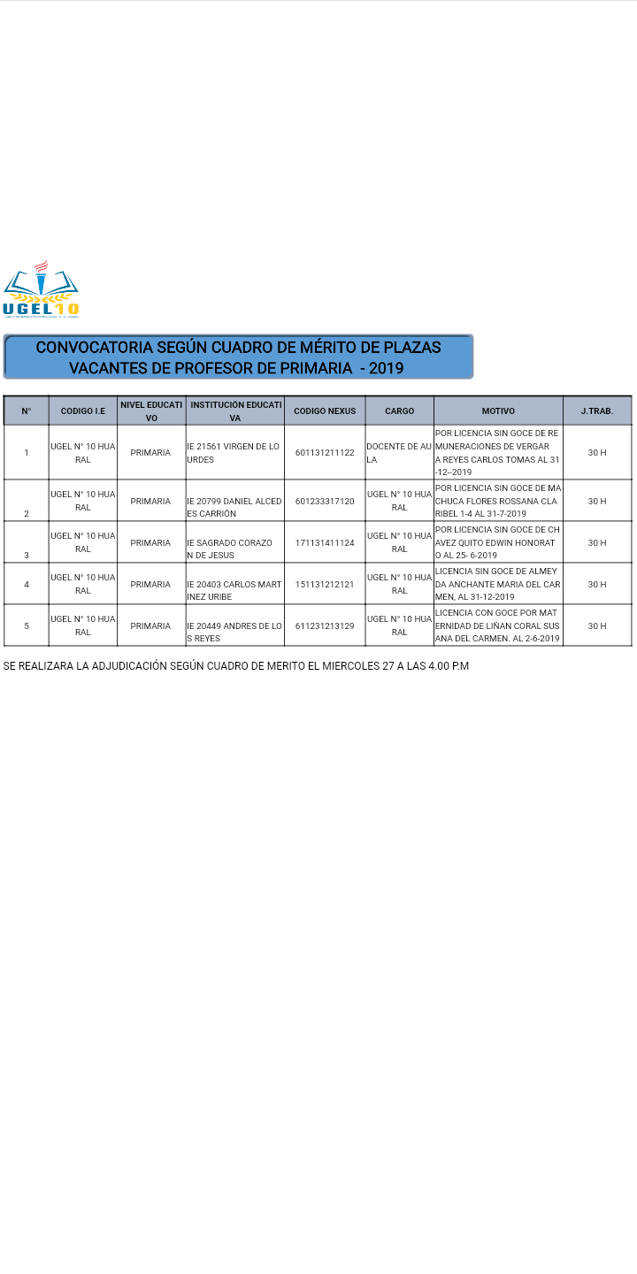26 Mar,2019 Convocatorias COMMENTS Convocatoria Según Cuadro de Mérito de Plazas Vacantes para Profesor de Primaria.