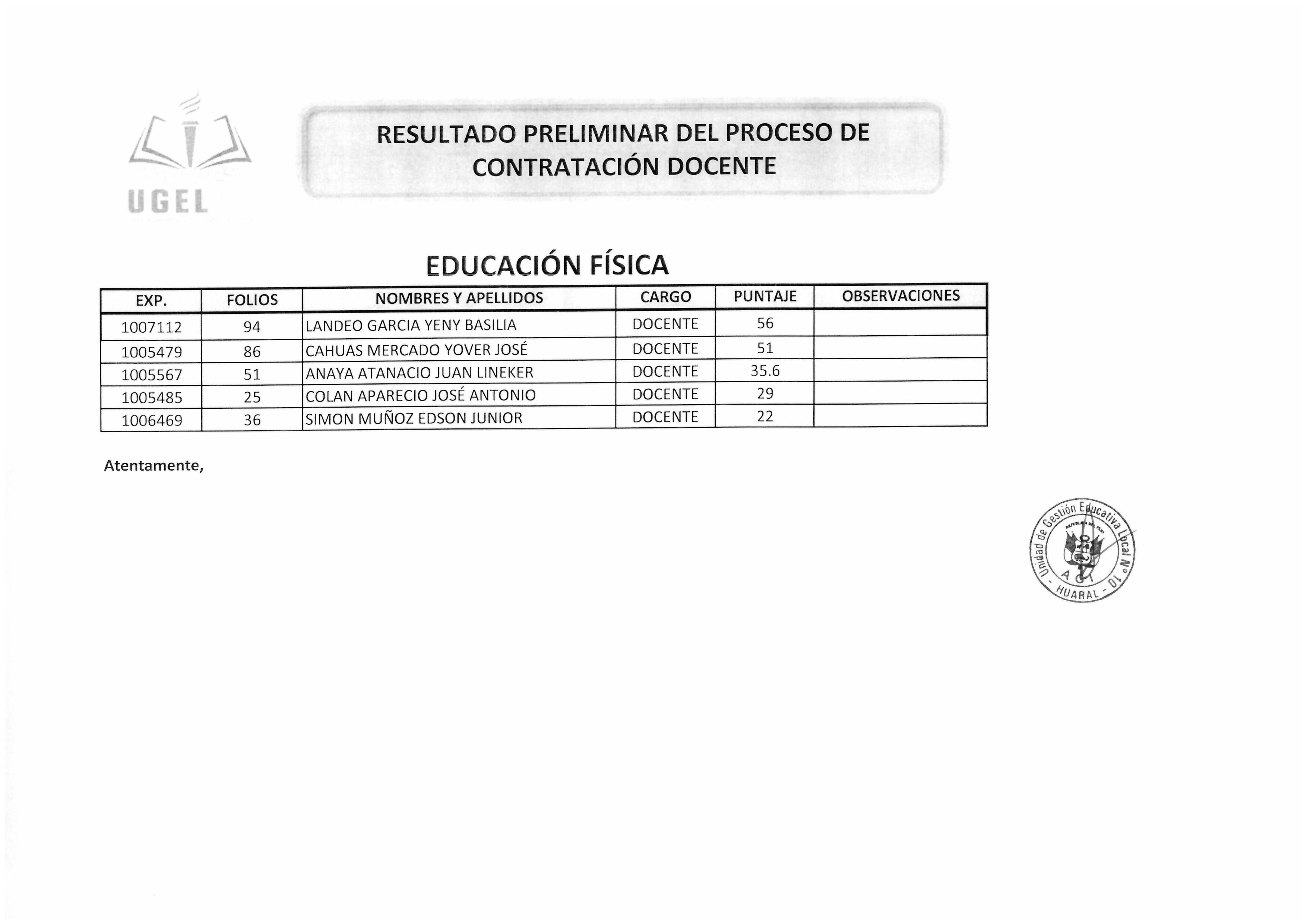 27 Mar,2019 Convocatorias COMMENTS RESULTADO PRELIMINAR DEL PROCESO DE CONTRATACIÓN DOCENTE - EDUCACIÓN FÍSICA