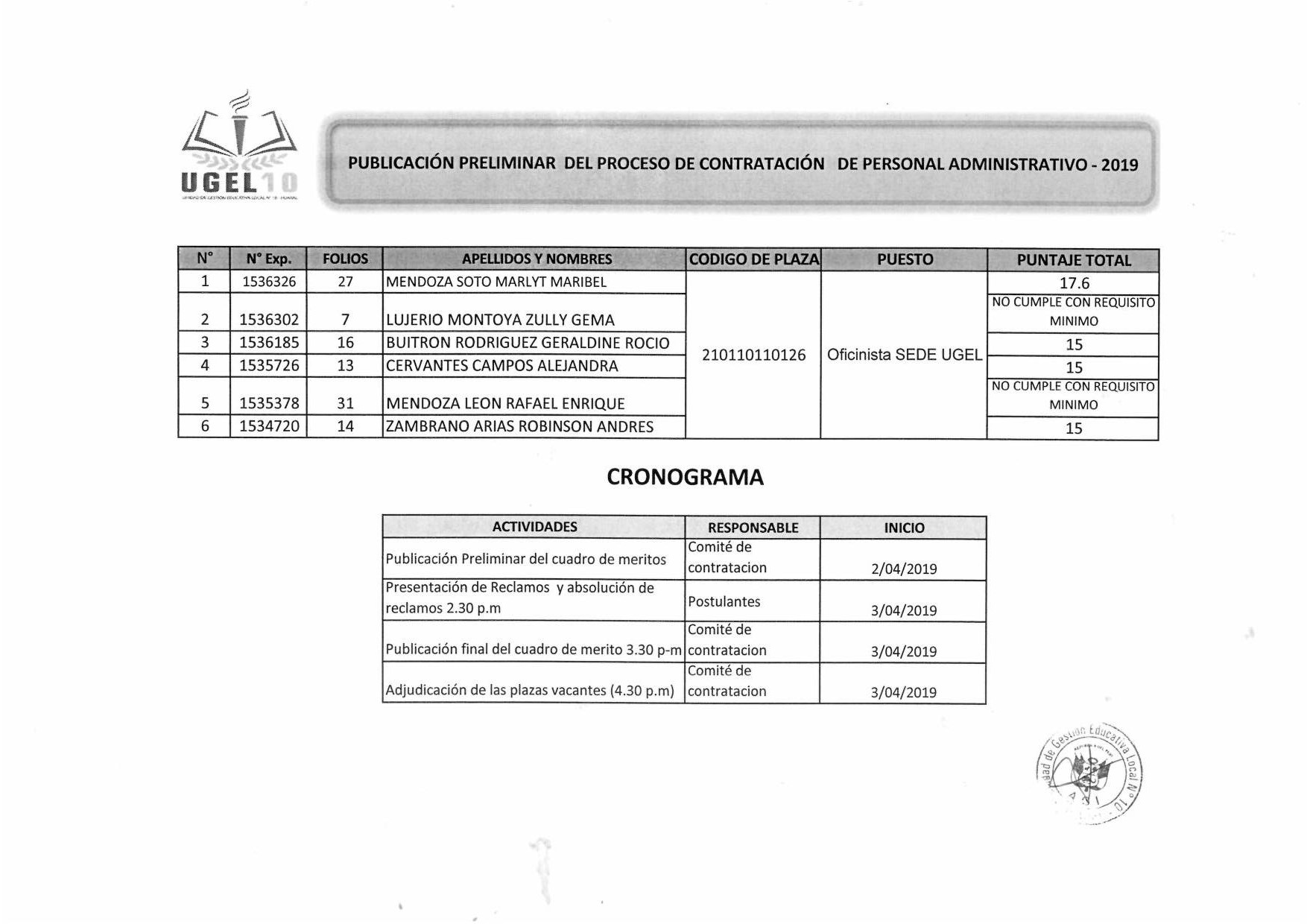 02 Abr,2019 Convocatorias COMMENTS Publicación Preliminar del Proceso de Contratación de Personal Administrativo - 2019.