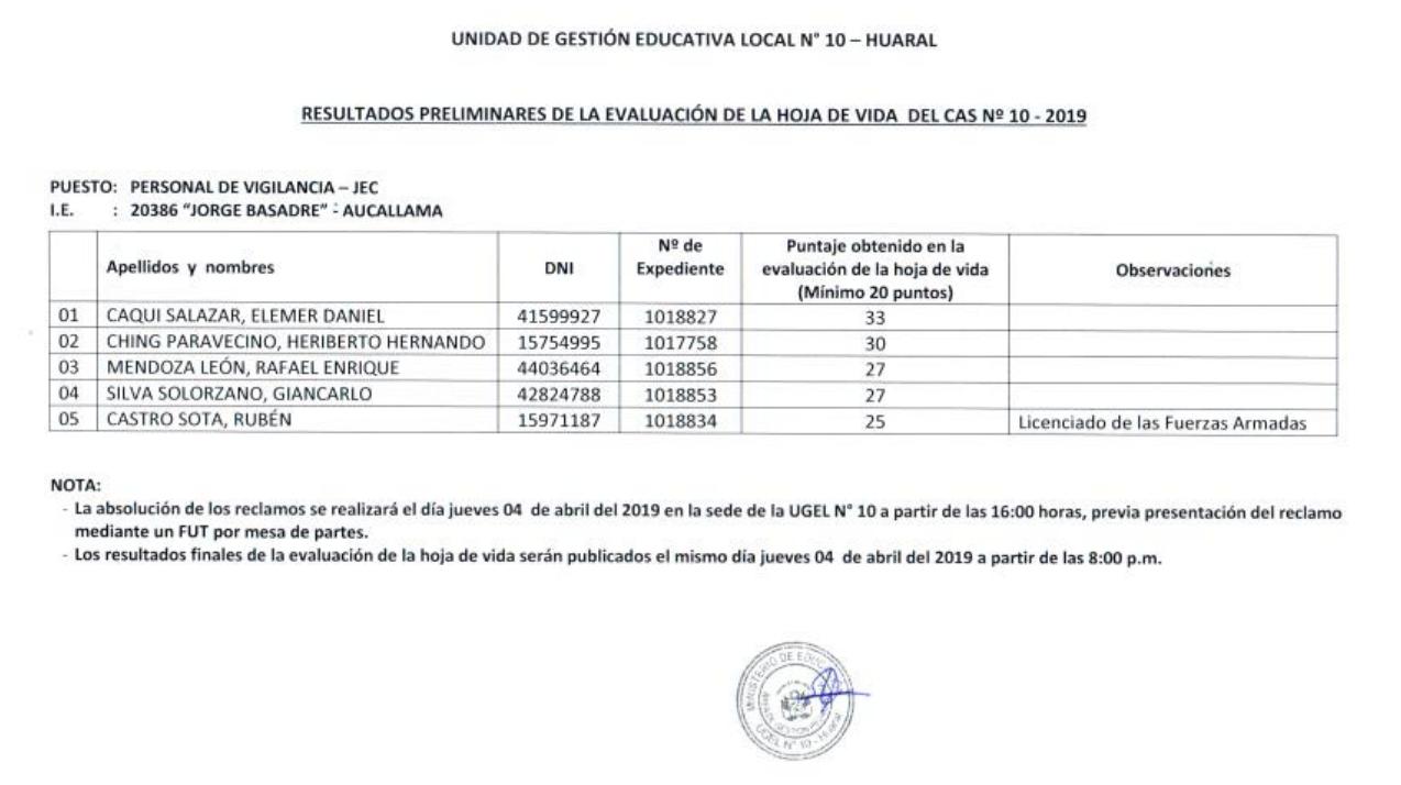 03 Abr,2019 Convocatorias COMMENTS CAS 10 - Resultado Preliminar de la Evaluación de la Hoja de Vida.