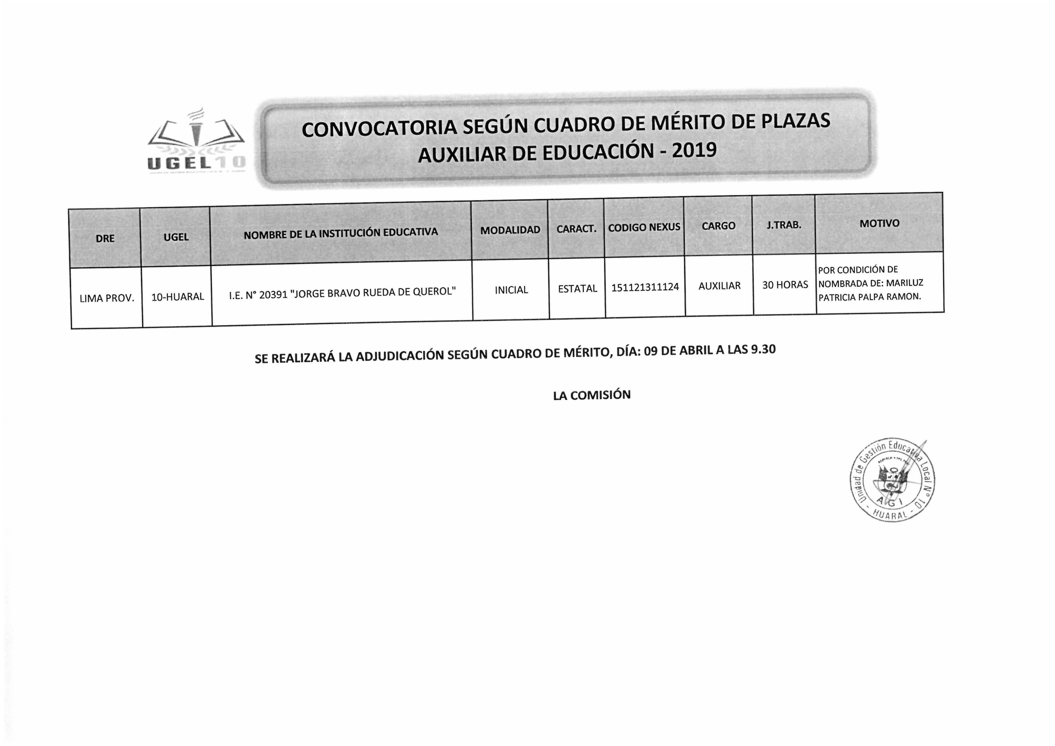 08 Abr,2019 Convocatorias COMMENTS CONVOCATORIA SEGÚN CUADRO DE MÉRITO DE PLAZAS AUXILIAR DE EDUCACIÓN-2019