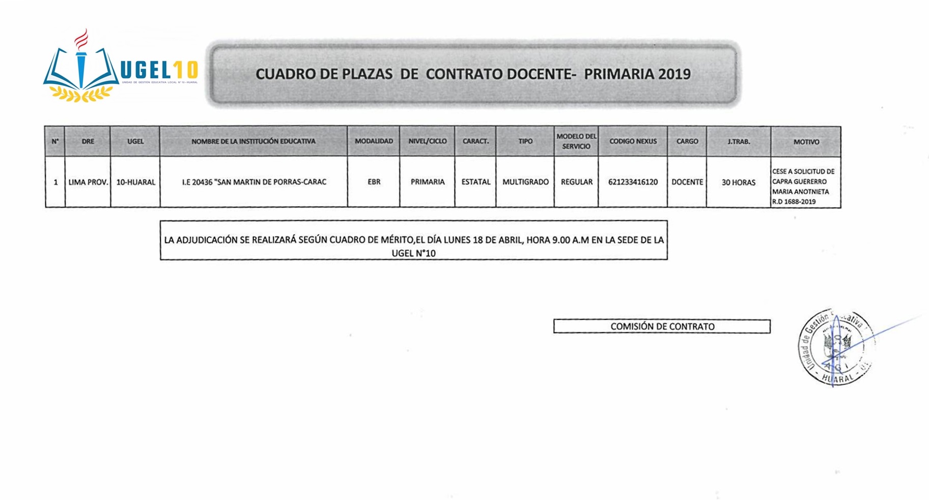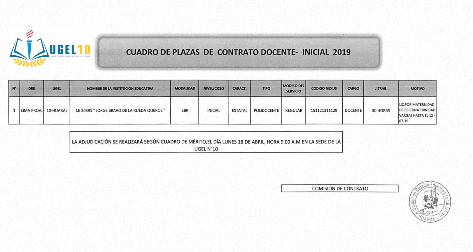 12 Abr,2019 Convocatorias COMMENTS Plazas de Contrato Vacante Según Cuadro de Mérito [Inicial - Primaria]