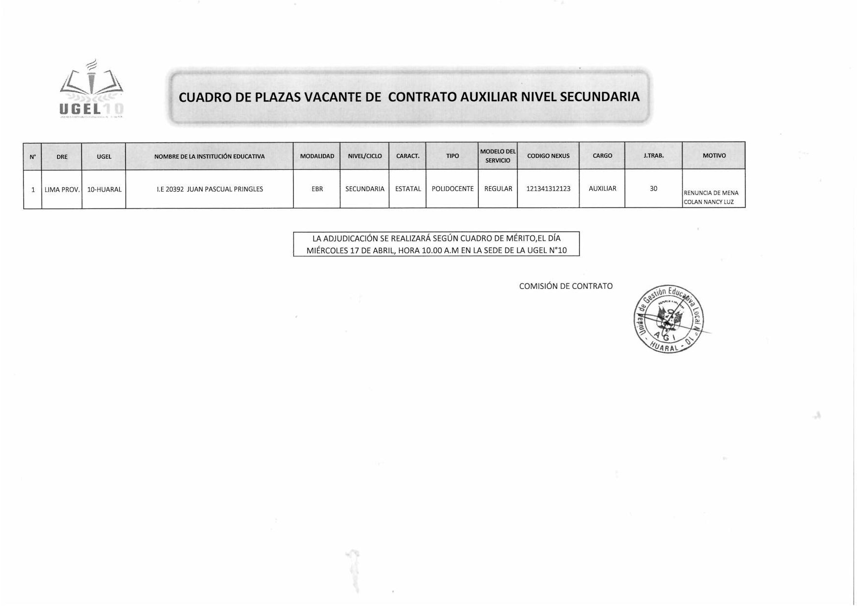 16 Abr,2019 Convocatorias COMMENTS Plazas Vacantes de Contrato Auxiliar según Cuadro de Mérito [Inicial-EBE-Secundaria]