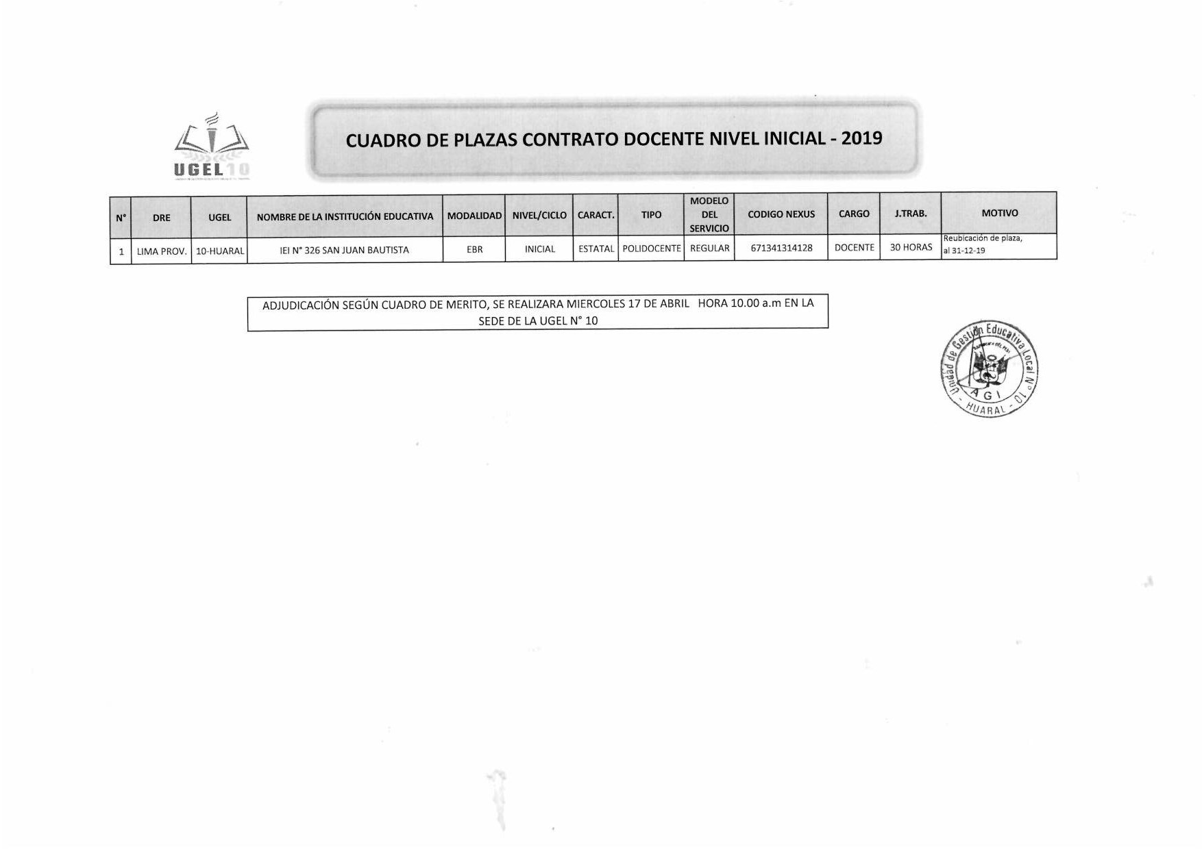 16 Abr,2019 Convocatorias COMMENTS Plaza Vacante Contrato Docente según Cuadro de Merito - Nivel Inicial