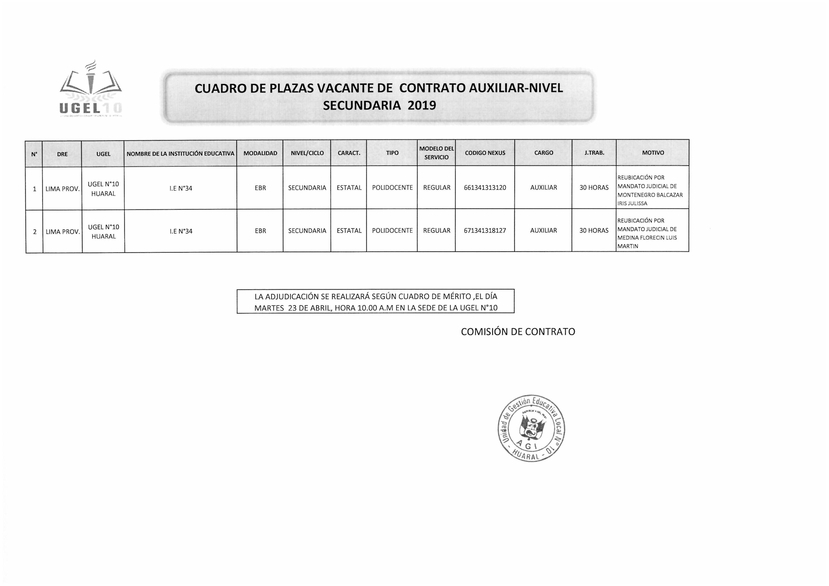 22 Abr,2019 Convocatorias COMMENTS CUADRO DE PLAZAS VACANTE DE CONTRATO AUXILIAR-NIVEL SECUNDARIA 2019