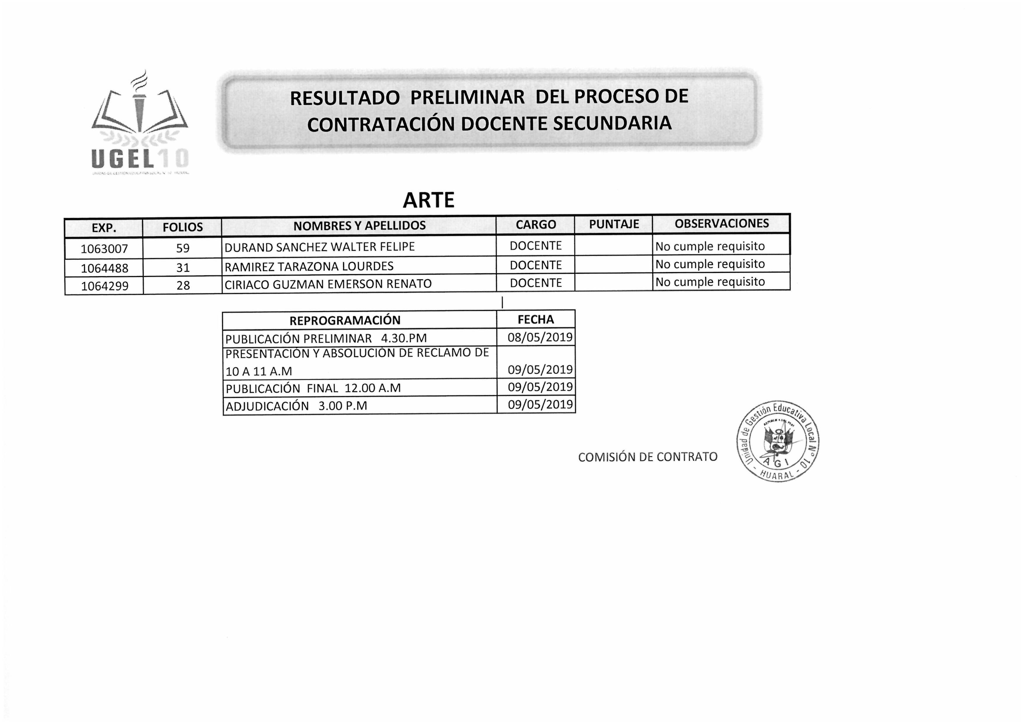 08 May,2019 Convocatorias COMMENTS RESULTADO PRELIMINAR DEL PROCESO DE CONTRATACIÓN DOCENTE SECUNDARIA - ARTE