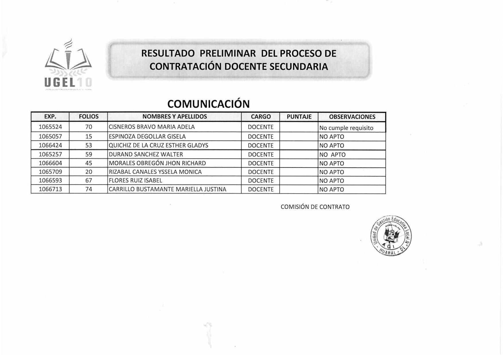09 May,2019 Convocatorias COMMENTS Resultado Preliminar del Proceso de Contratación Docente Secundaria [Comunicación]