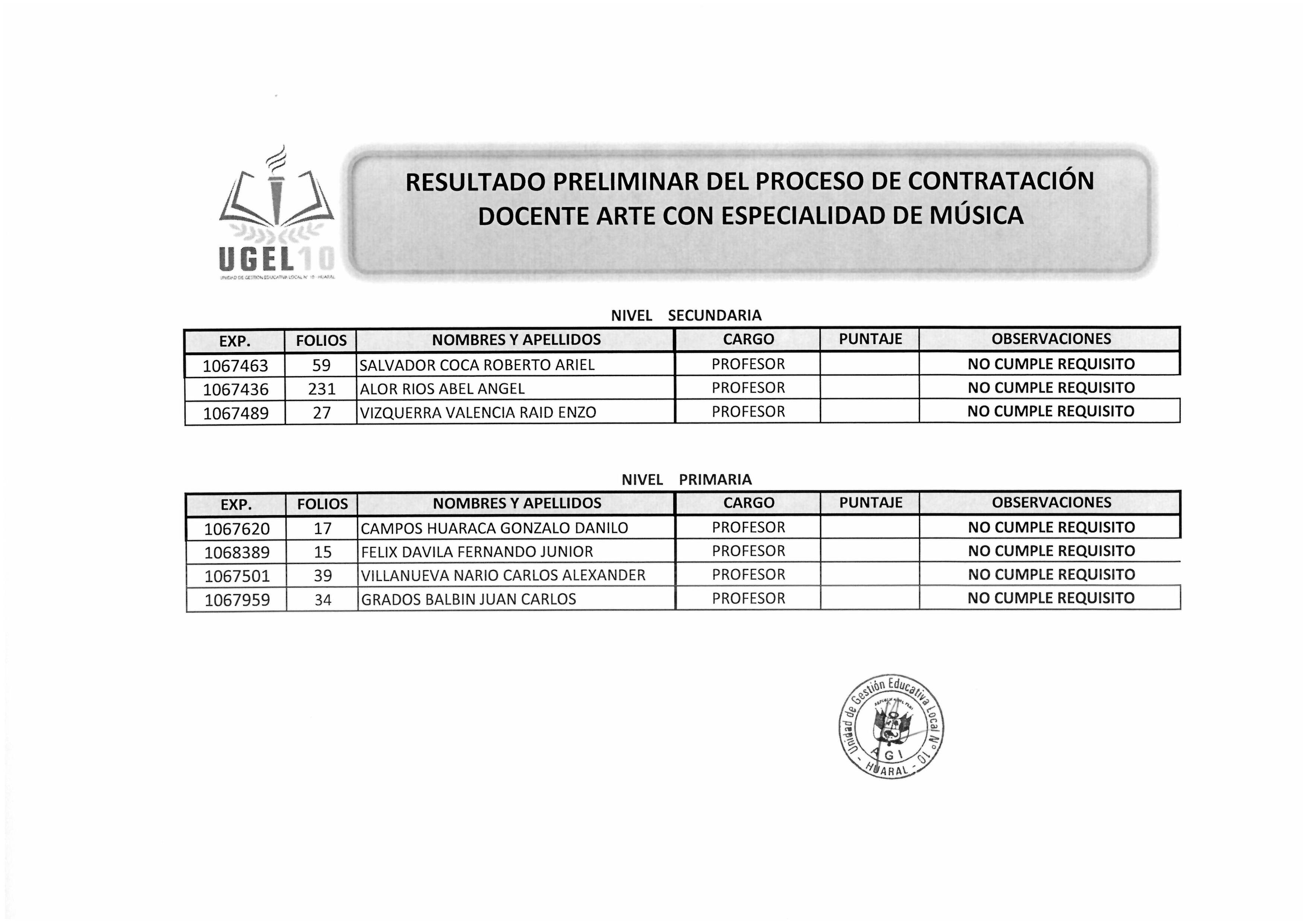 10 May,2019 Convocatorias COMMENTS RESULTADO PRELIMINAR DEL PROCESO DE CONTRATACIÓN DOCENTE ARTE CON ESPECIALIDAD DE MÚSICA