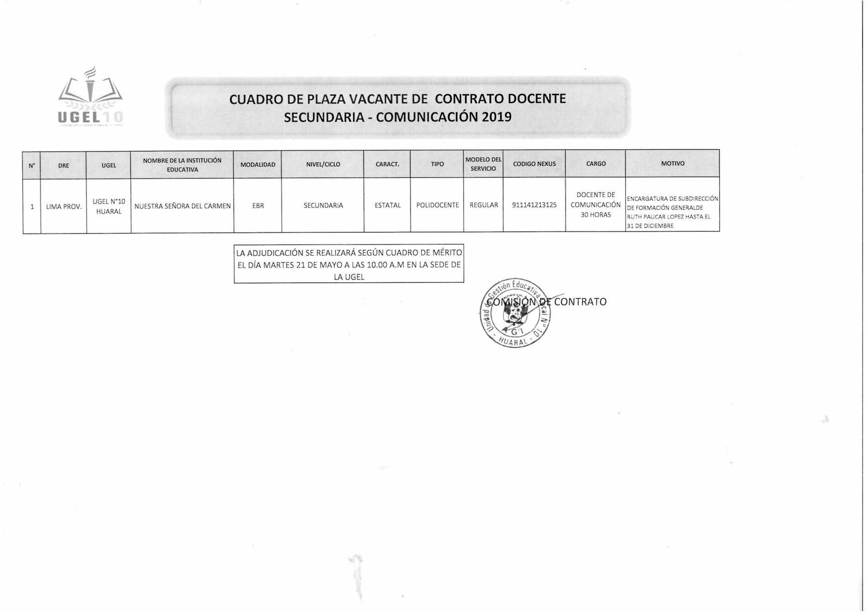 20 May,2019 Convocatorias COMMENTS Plaza Vacante de Contrato Docente Secundaria [Comunicación] según cuadro de mérito.
