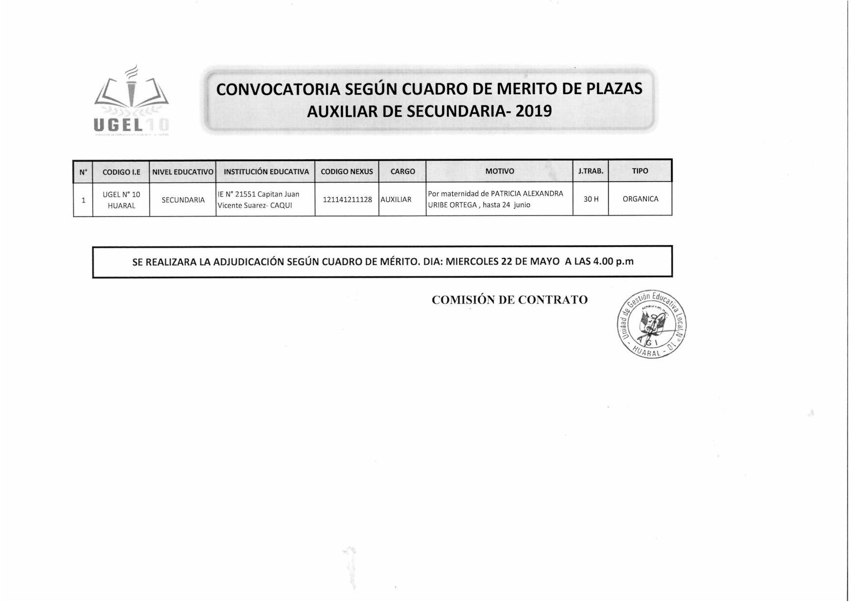 21 May,2019 Convocatorias COMMENTS Convocatoria de Plaza de Auxiliar de Secundaria según Cuadro de Mérito.