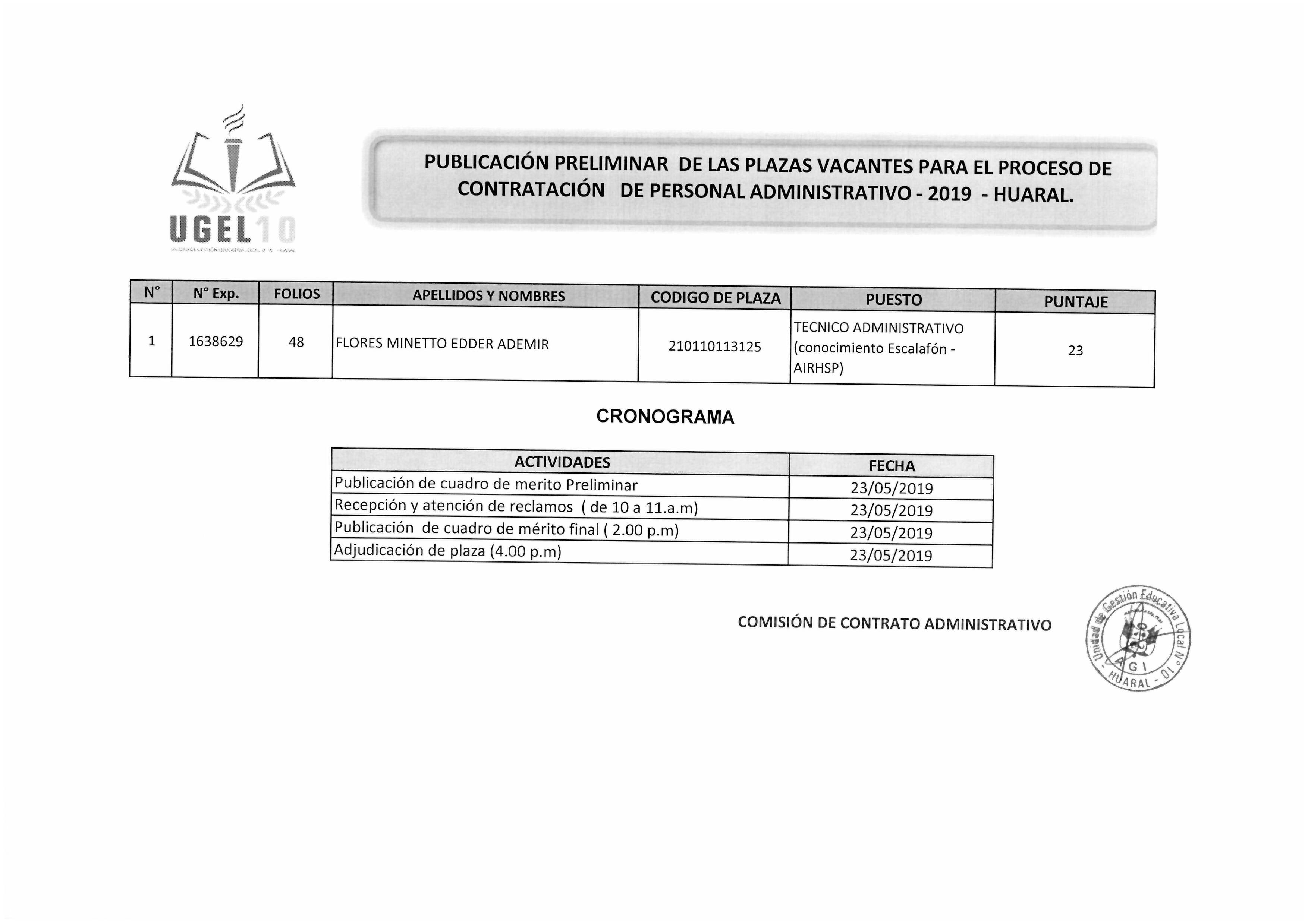 23 May,2019 Convocatorias COMMENTS PUBLICACIÓN PRELIMINAR DE LAS PLAZAS VACANTES PARA EL PROCESO DE CONTRATACIÓN DE PERSONAL ADMINISTRATIVO 2019