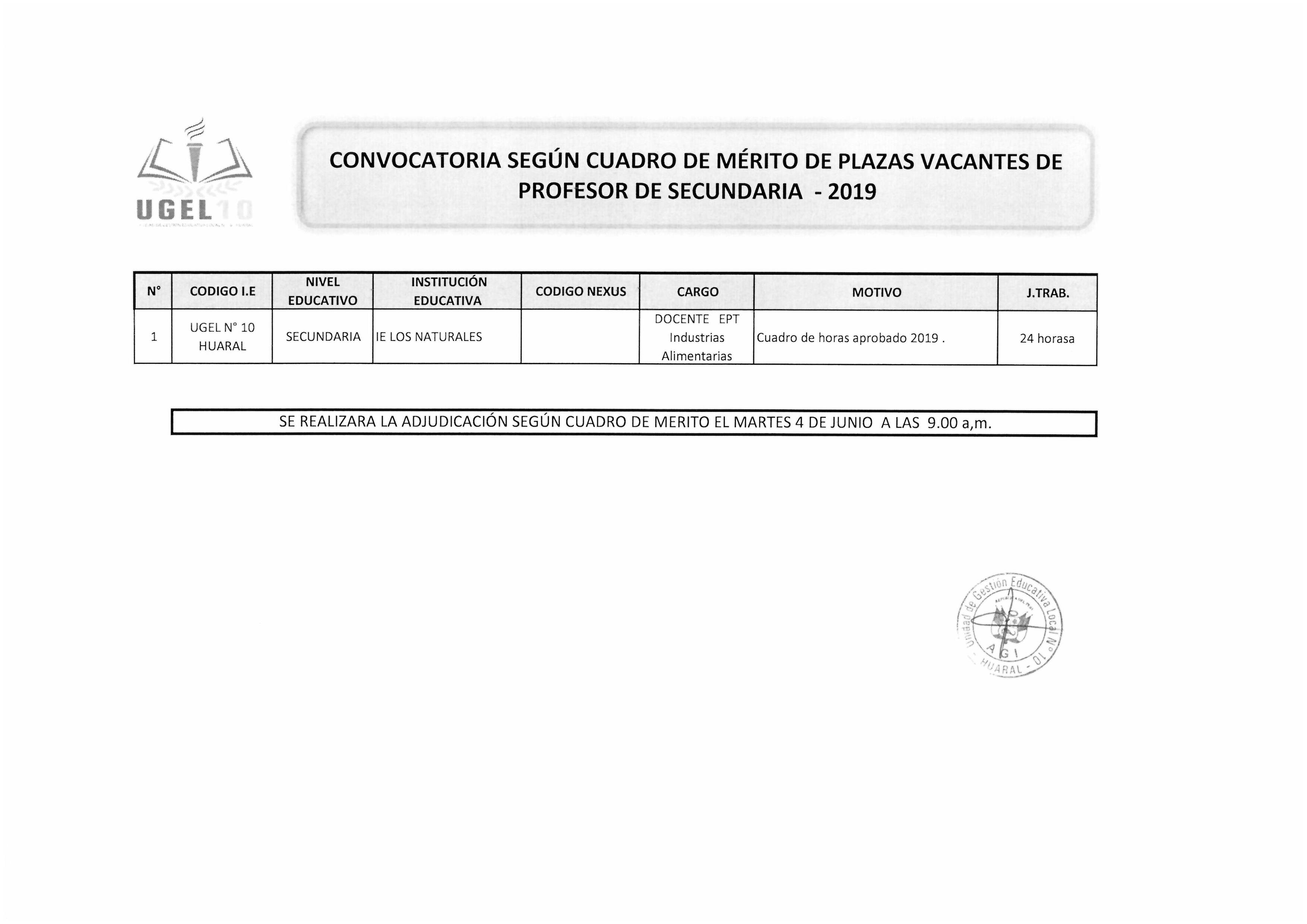 03 Jun,2019 Convocatorias COMMENTS CONVOCATORIA SEGÚN CUADRO DE MERITO DE PLAZAS VACANTES DE PROFESOR DE SECUNDARIA.
