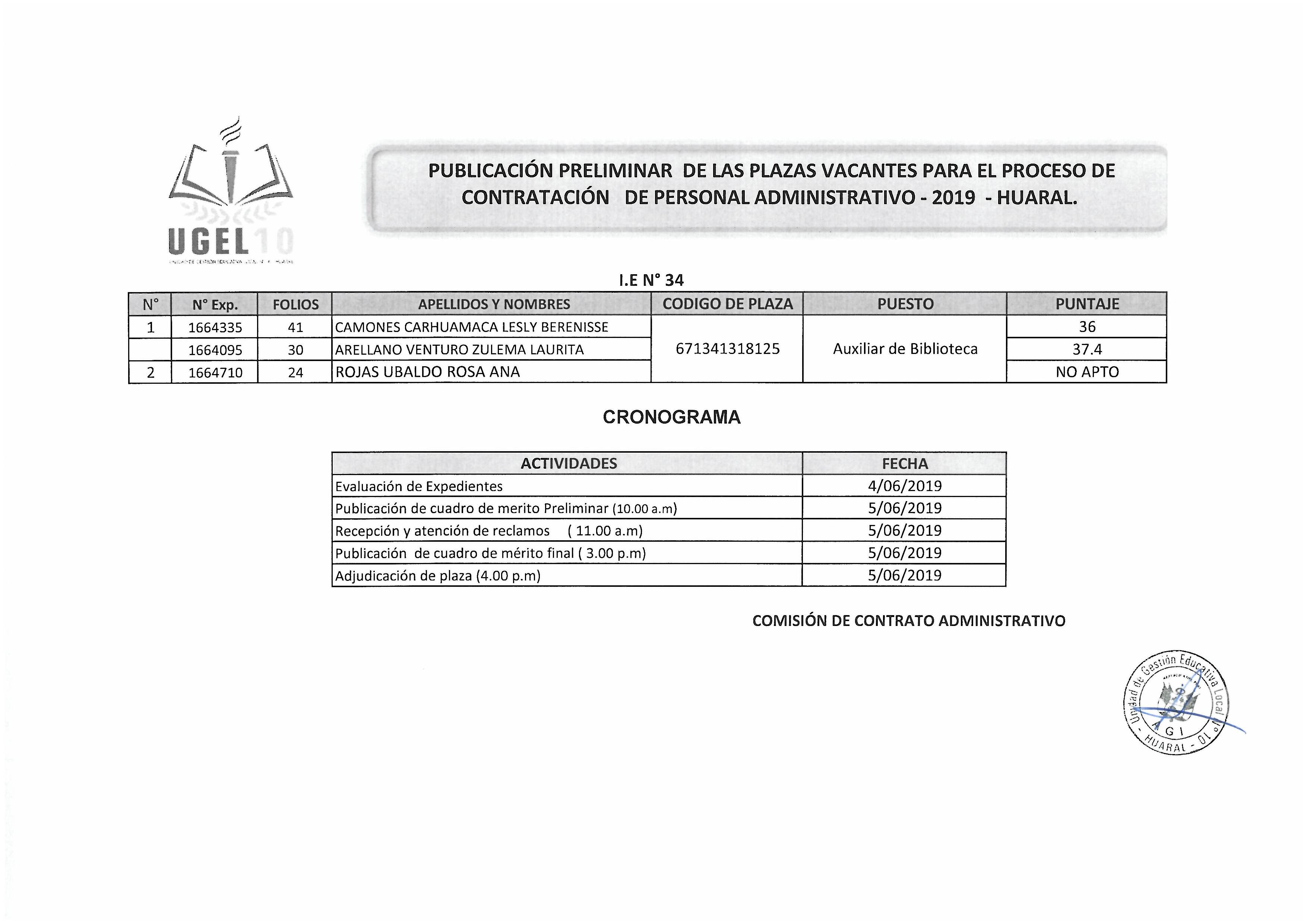 04 Jun,2019 Convocatorias COMMENTS PUBLICACIÓN PRELIMINAR DE LAS PLAZAS VACANTES PARA EL PROCESO DE CONTRATACIÓN DE PERSONAL ADMINISTRATIVO- 2019 I.E N°34