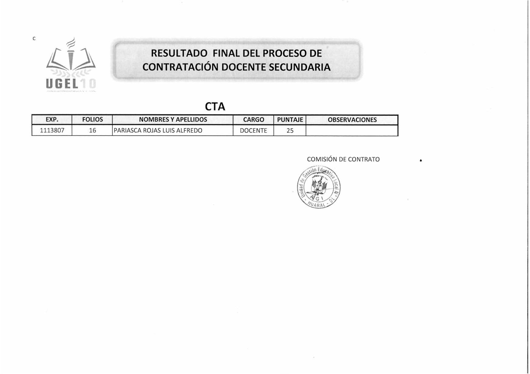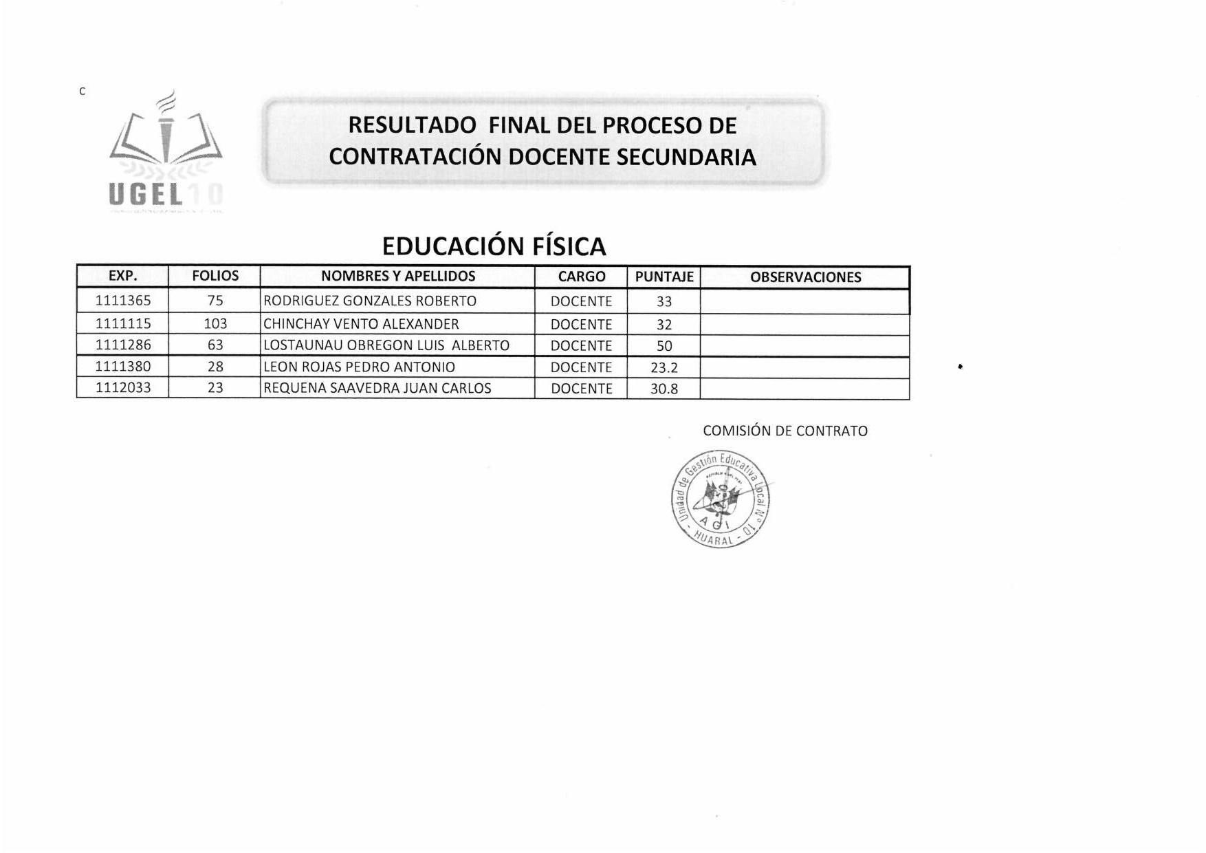 13 Jun,2019 Convocatorias COMMENTS Resultado Final del Proceso de contratación Docente Secundaria [Educ. Física - CTA]