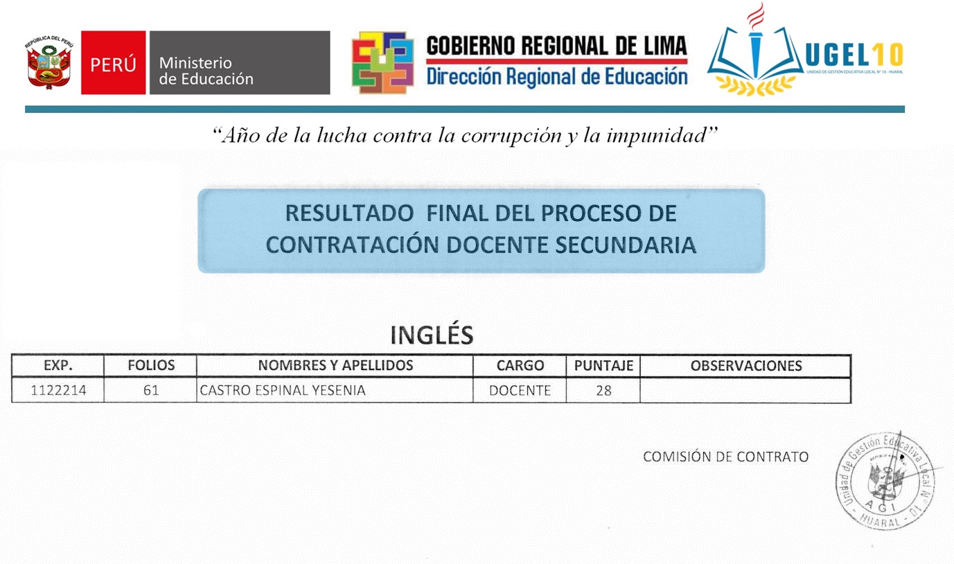 21 Jun,2019 Convocatorias COMMENTS Resultado Final del Proceso de Contratación Docente Secundaria [Inglés]