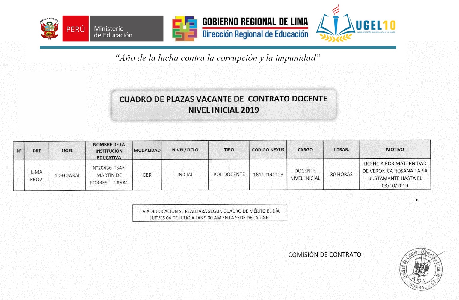 03 Jul,2019 Convocatorias COMMENTS Plaza Vacante de Contrato Docente Nivel Inicial según Cuadro de Mérito.