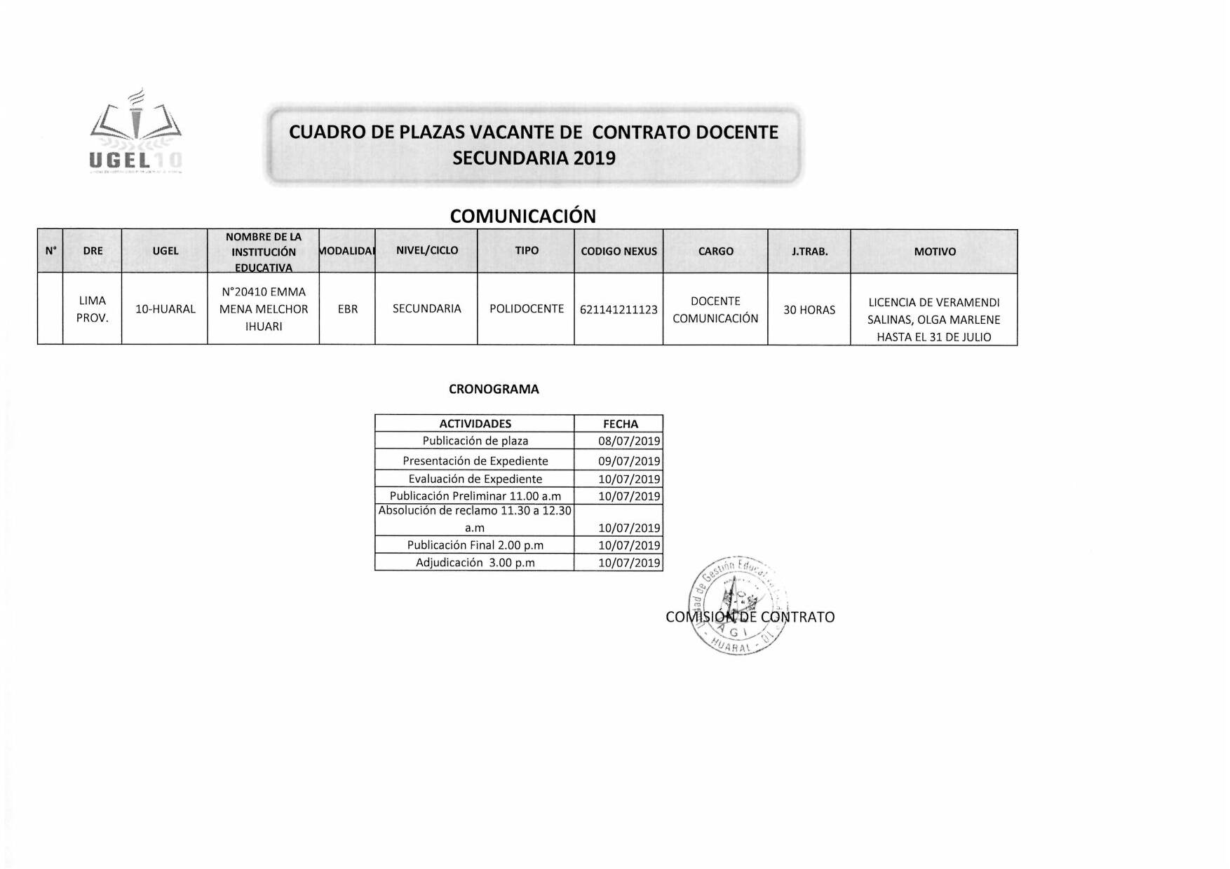 08 Jul,2019 Convocatorias COMMENTS CUADRO DE PLAZAS VACANTE DE CONTRATO DOCENTE SECUNDARIA 2019 - COMUNICACIÓN