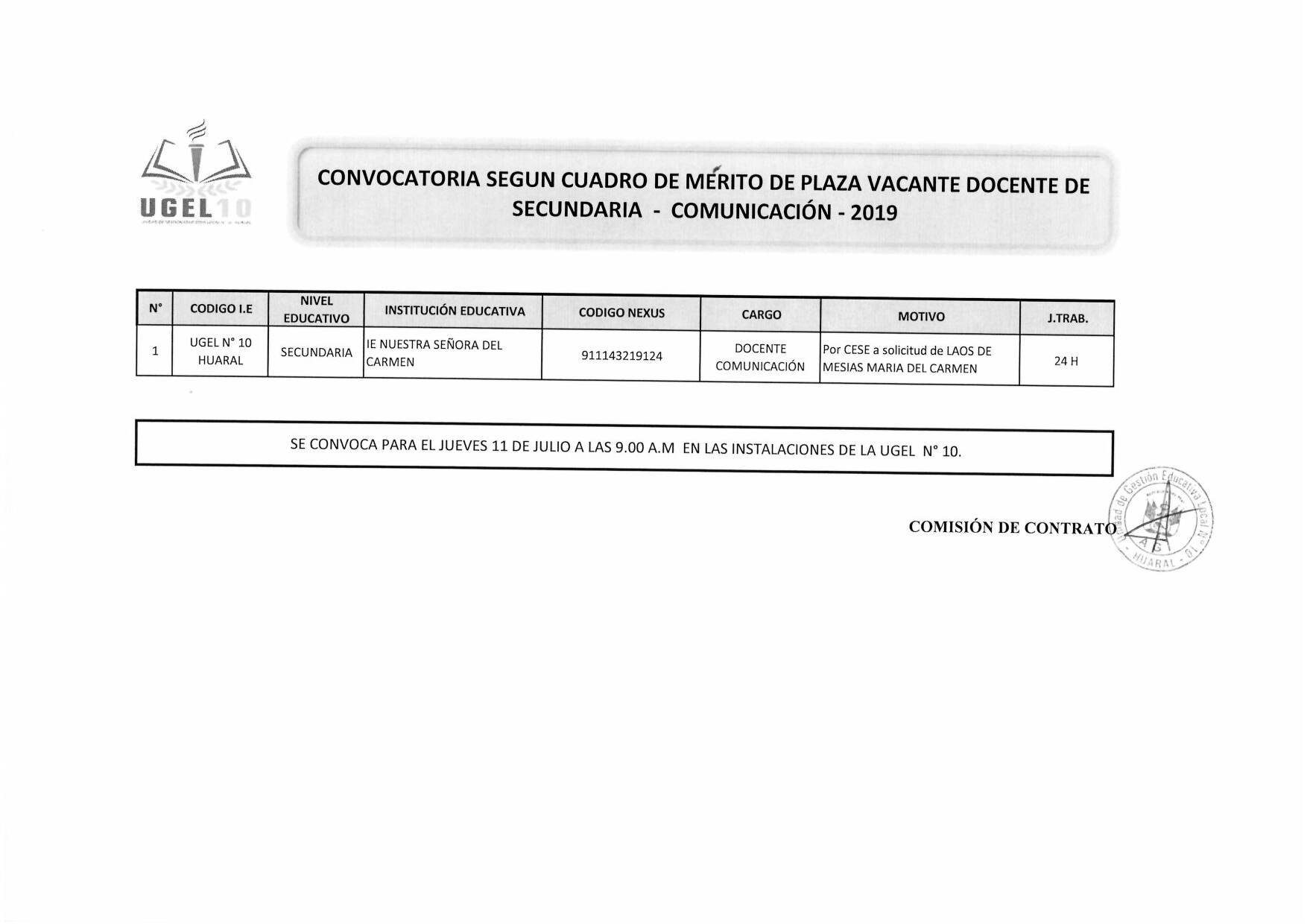 10 Jul,2019 Convocatorias COMMENTS CONVOCATORIA SEGUN CUADRO DE MERITO DE PLAZA VACANTE DOCENTE DE SECUNDARIA - COMUNICACIÓN 2019