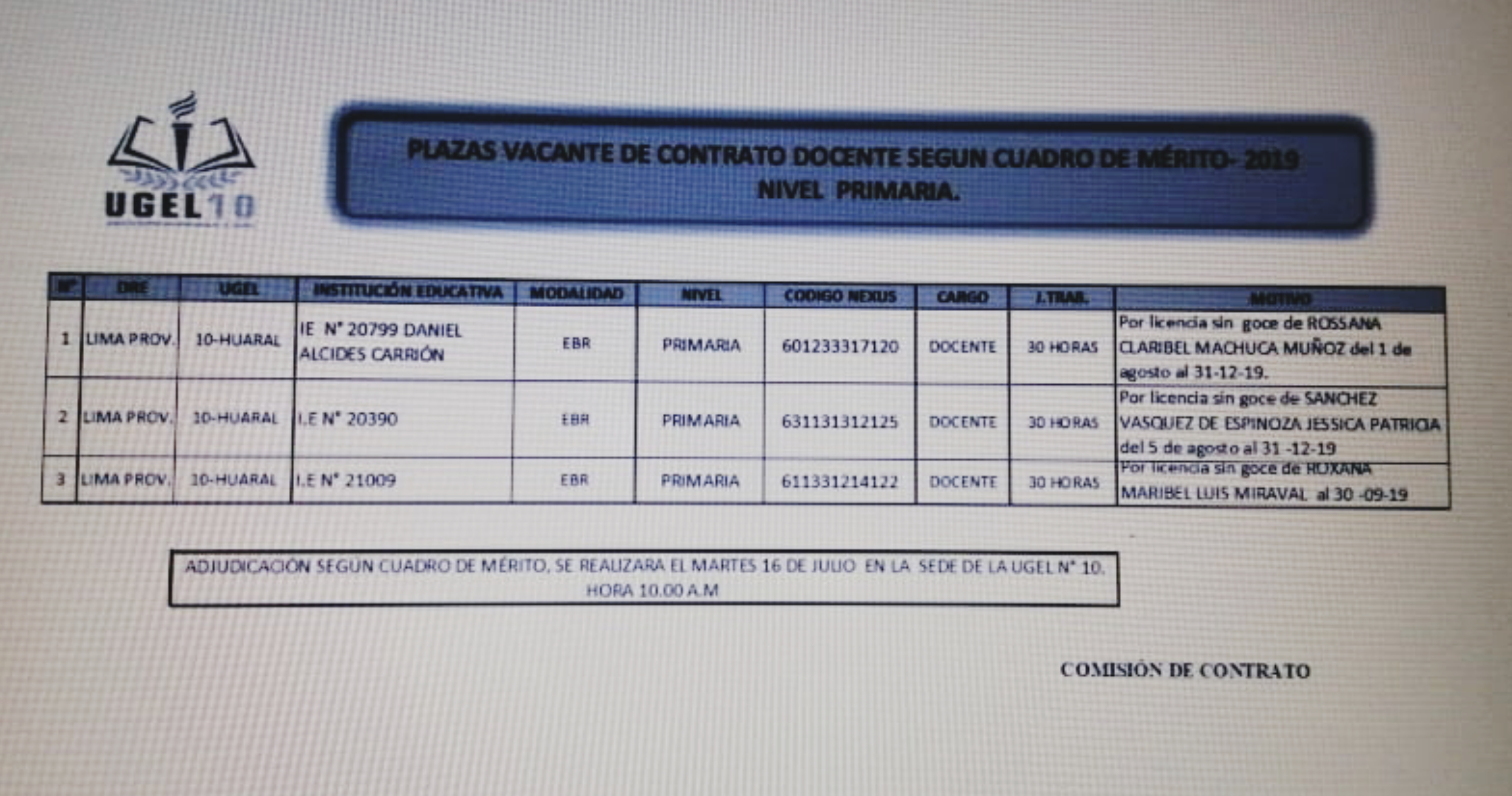 15 Jul,2019 Convocatorias COMMENTS Plaza Vacante de Contrato Docente Según Cuadro de Mérito - nivel primaria
