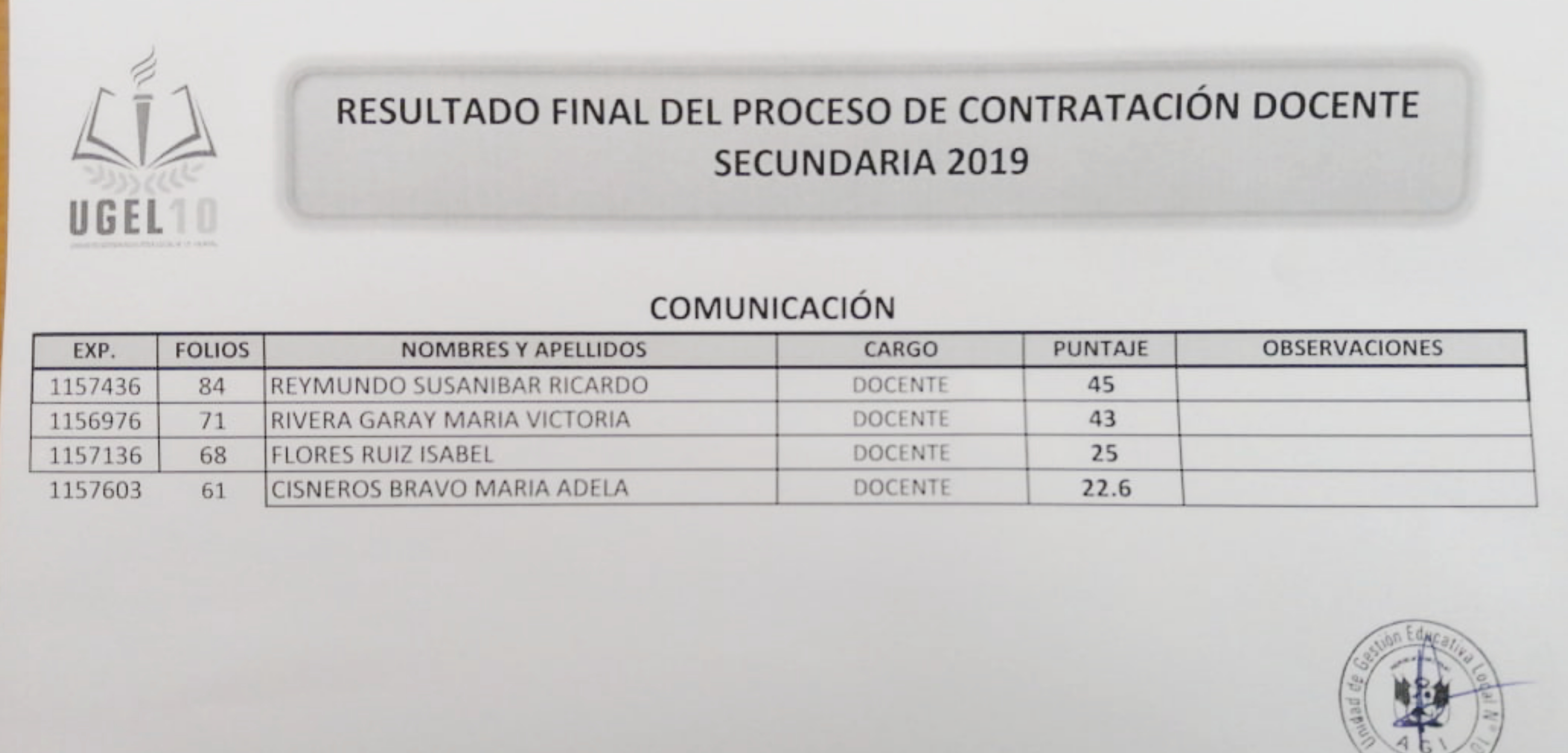 16 Jul,2019 Convocatorias COMMENTS Resultado Final del Proceso de Contratación Docente (comunicación)